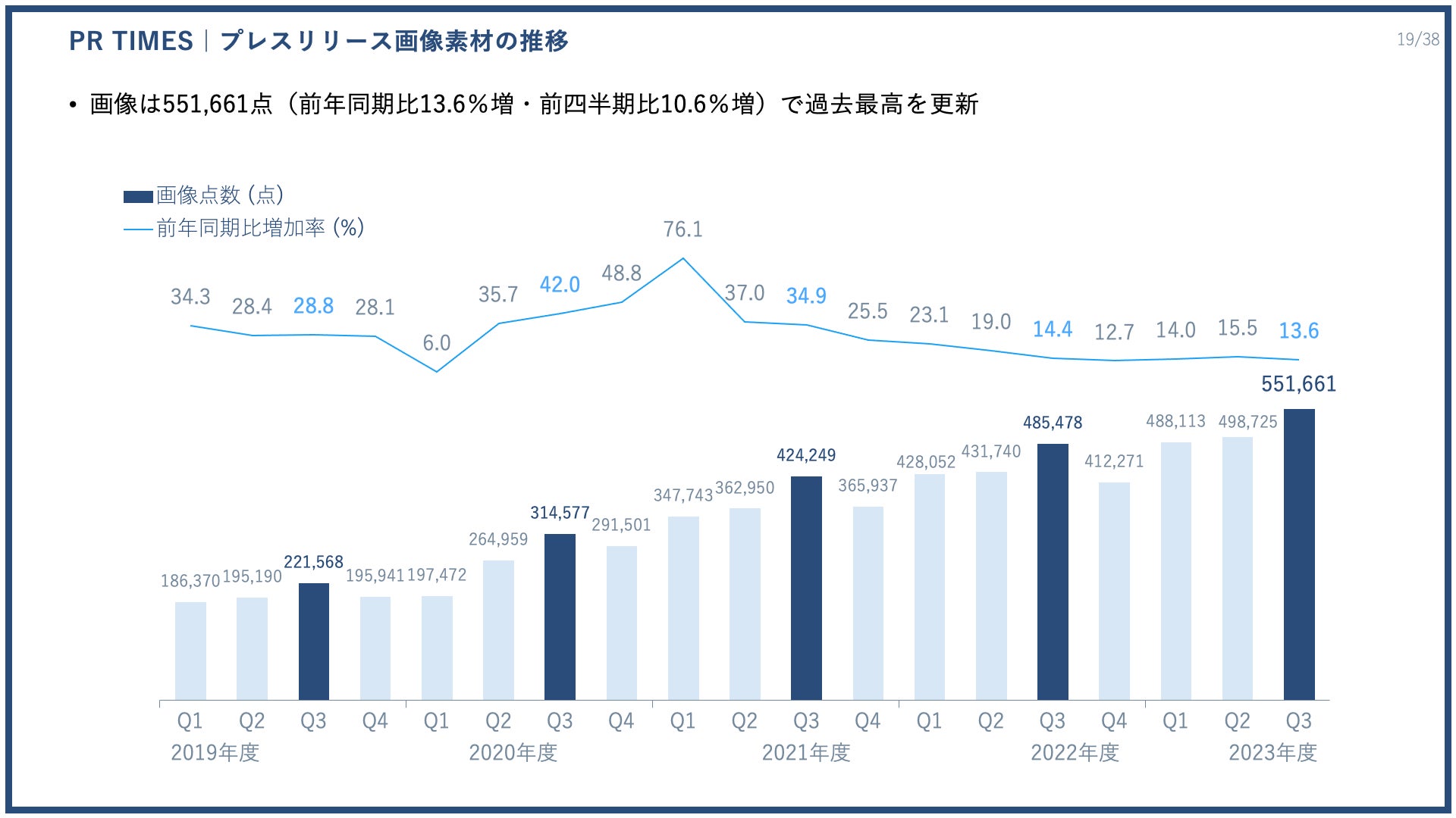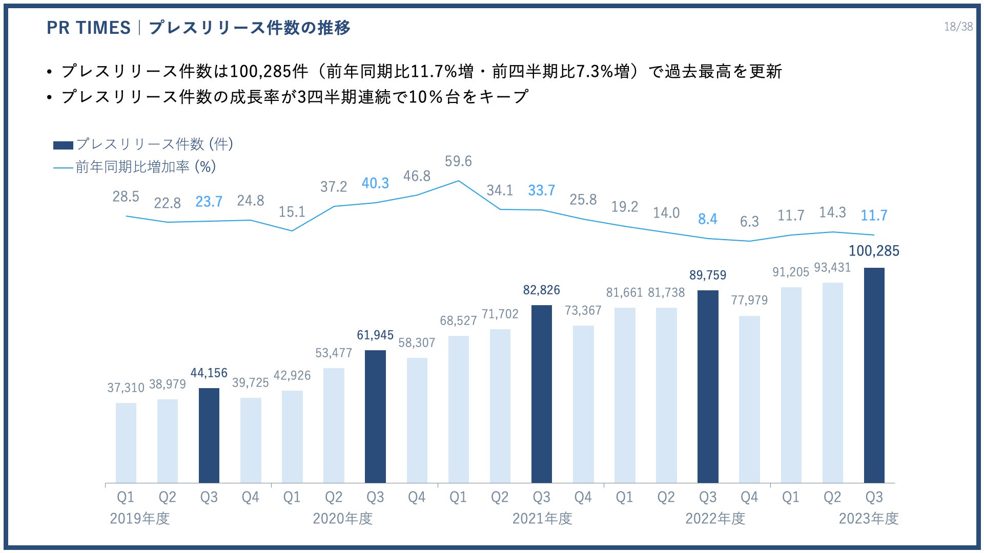 2023年度第3四半期は、10万285件(前年同期比11.7%増、前四半期比7.3%増)のプレスリリースを配信いただき、過去最高を更新しています。プレスリリース件数の成長率は3四半期連続で10%台をキープしています。