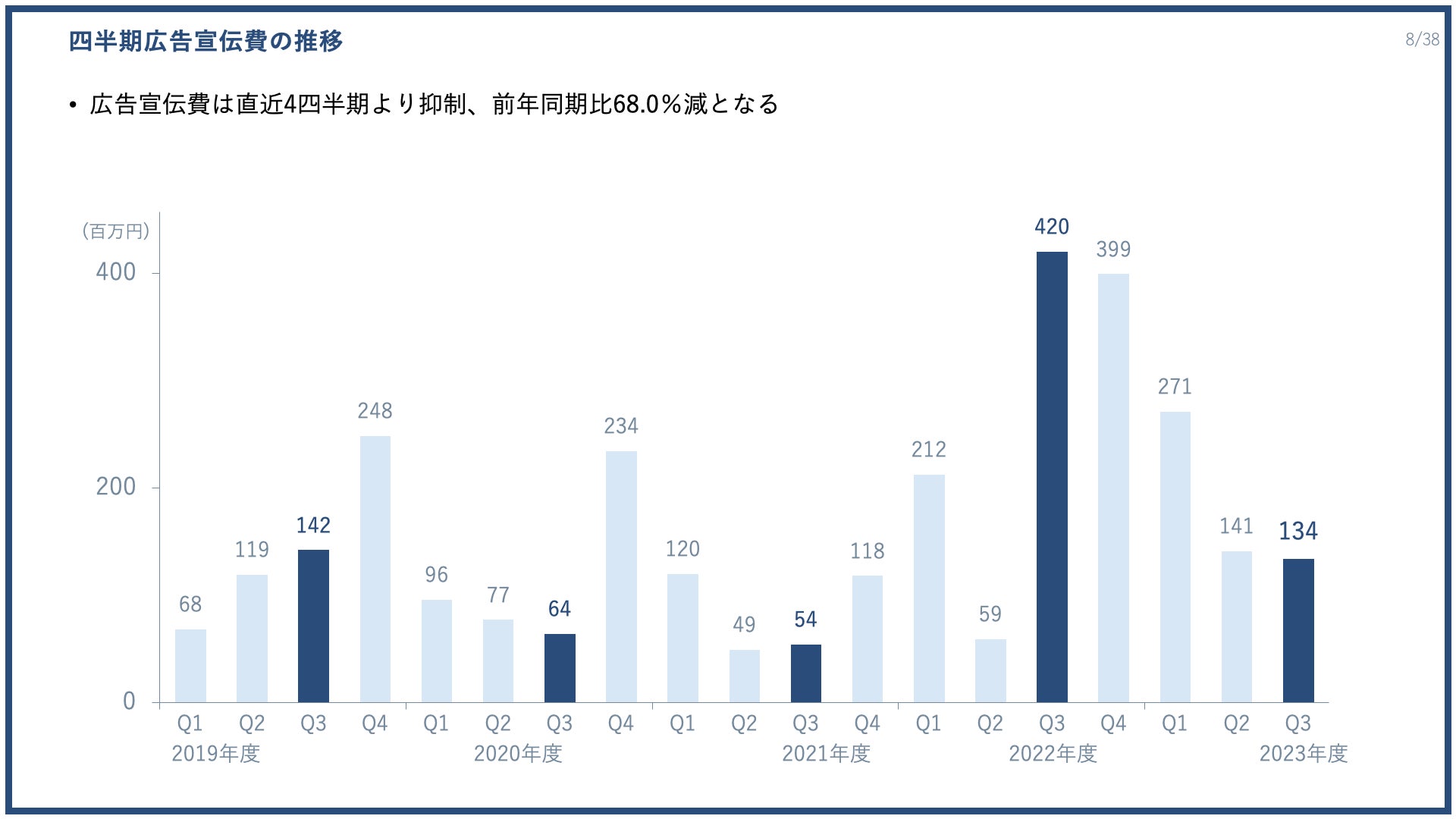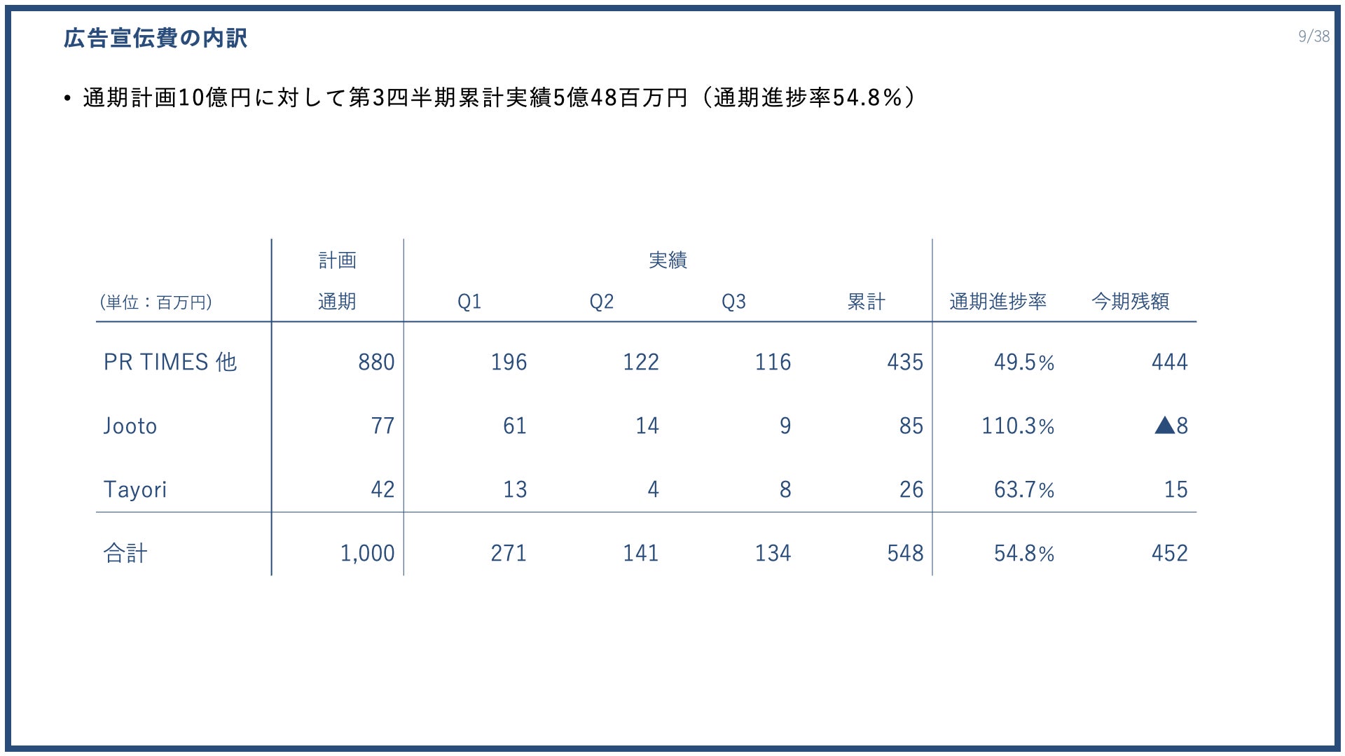 S&Mの中で、広告宣伝費は想定より下回る投資となり、直近4四半期より抑制して、前年同期比では68.0%減となりました。今期は広告宣伝費に10億円を投じる見通しを示していますが、第3四半期の累計実績で5億4800万円と通期計画に対する進捗率は54.8%となりました。