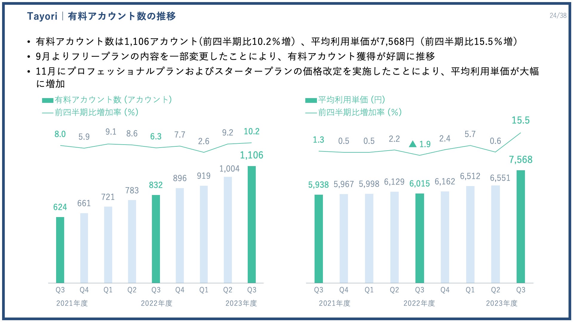 また、11月にプロフェッショナルプランおよびスタータープランの価格改定を実施した結果、1アカウントあたりの平均利用単価が7568円(前四半期比15.5%増)となりました。