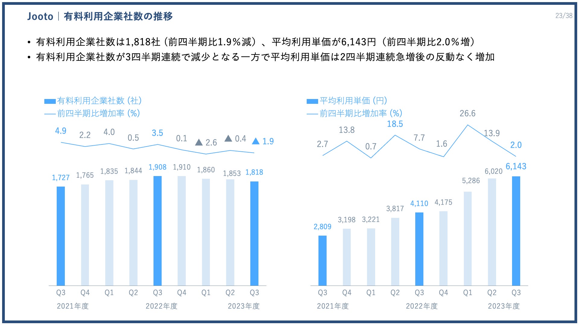 11月末時点の有料利用企業社数は1818社で、3月に割安な旧料金体系を終了したことによる影響で、前四半期比で35社減(1.9%減)となっています。一方で1社あたりの平均利用単価は2四半期連続急増の反動もなく、6143円(前四半期比2.0%増)となりました。