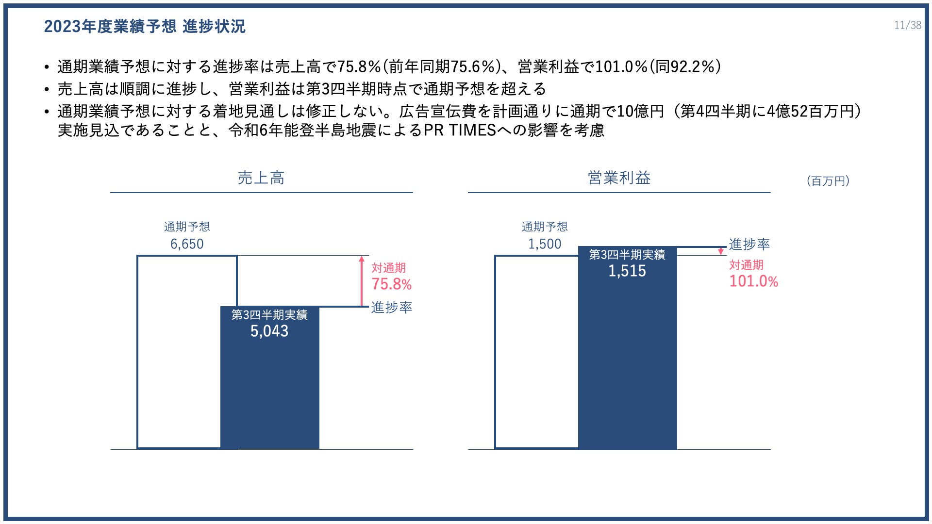 2023年度第3四半期を経過して、業績予想に対して順調に進捗しています。売上高は通期予想66億5000万円に対し、進捗率は75.8%、営業利益は通期予想15億円に対し、進捗率は101.0%となっています。営業利益が第3四半期時点で通期予想を超えていますが、通期業績に対する着地見込の修正はございません。広告宣伝費を計画通りに通期で10億円(第4四半期に4億5200万円)実施見込であること、および令和6年能登半島地震によるPR TIMESへの影響を考慮しています。