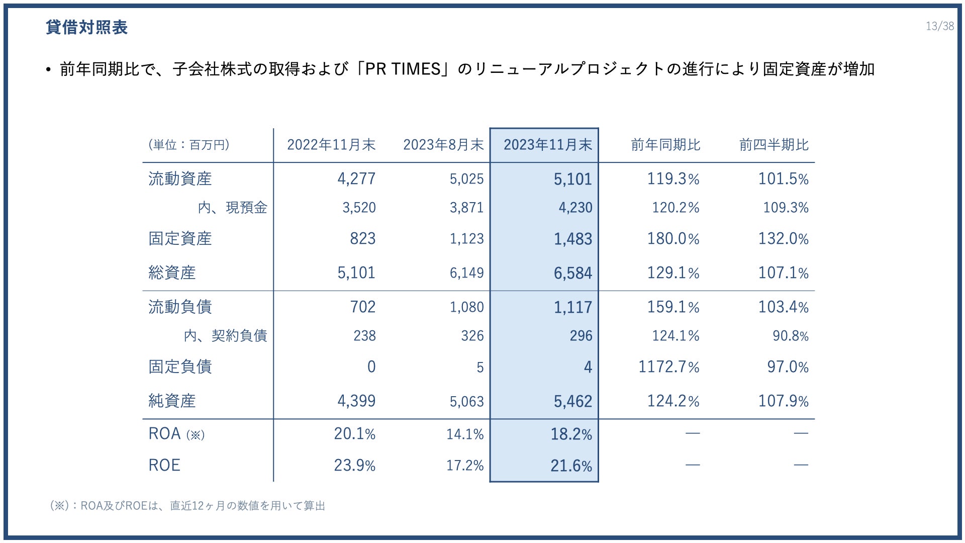 業績概況の最後に、バランスシートをご紹介いたします。前年同期比では、子会社株式の取得およびPR TIMESのリニューアルプロジェクトの進行等により固定資産が増加しています。ROAは18.2%とROEは21.6%となりました。