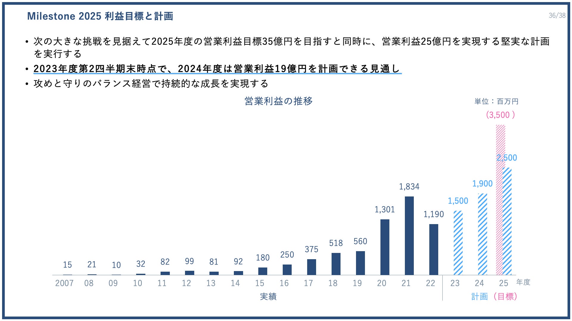 中期経営目標「Milestone2025」に向けた現時点の計画と見通しについてお伝えいたします。次の大きな挑戦を見据えて2025年度の営業利益目標35億円を目指すと同時に、営業利益25億円を実現する堅実な計画を実行してまいります。2023年度第3四半期末時点で、2024年度は営業利益19億円を計画できる見通しとなっています。攻めと守りのバランス経営で持続的な成長を実現してまいります。