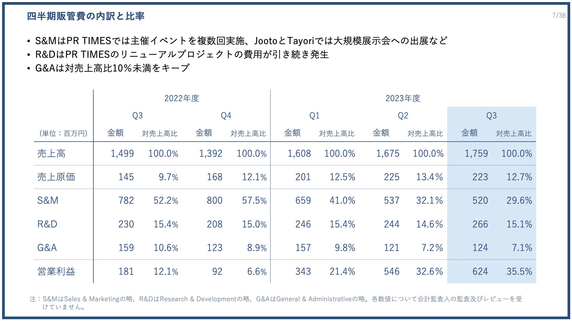 販売管理費の内訳について、S&M、R&D、G&Aで金額と対売上高比を記載しています。第3四半期のS&Mは、「PR TIMES」の主催イベントを複数回実施したこと、「Jooto」と「Tayori」で大規模展示会への出展を実施し、対売上高比は29.6%となりました。R&Dは「PR TIMES」のリニューアルプロジェクトの費用が引き続き発生し、対売上高比15.1%となりました。G&Aは、対売上高比7.1%と10%未満をキープしています。