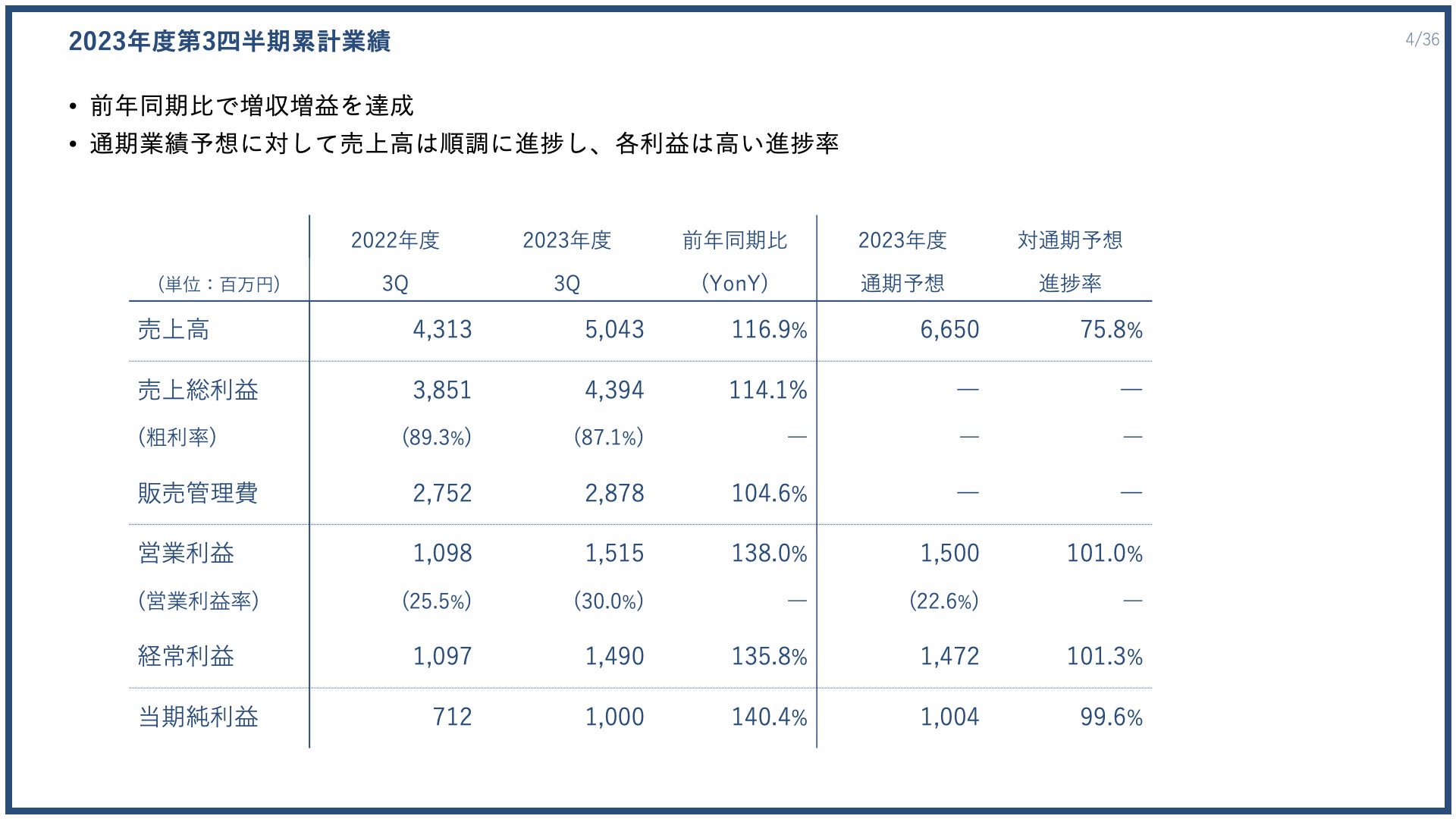 2023年度第3四半期までの累計の業績では、売上高50億4300万円、営業利益15億1500万円、当期純利益10億円となりました。前年同期比で、売上高は116.9%、営業利益は138.0%、当期純利益は140.4%となっております。