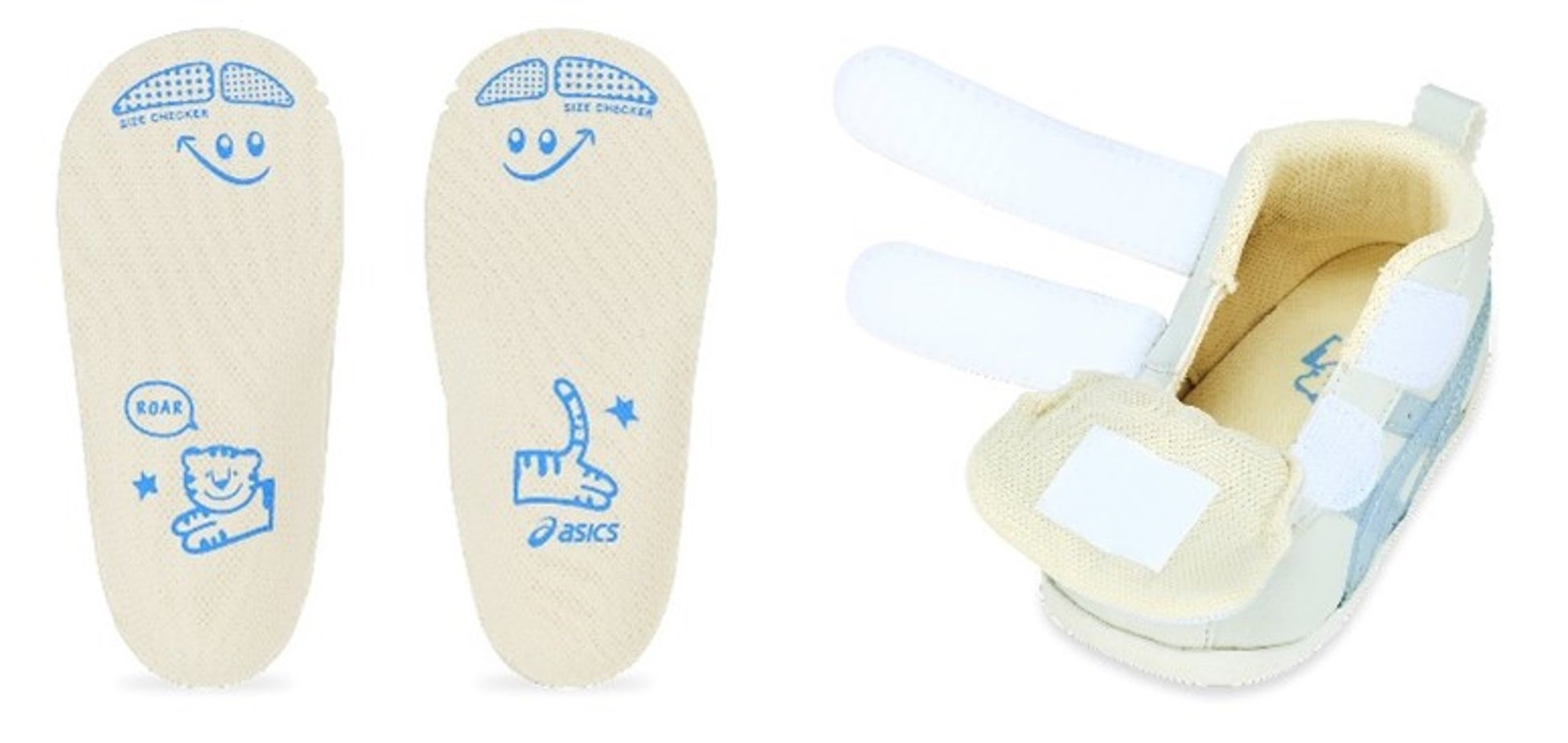 読者の声を反映し、アッパー(甲被)は、ホワイトを基調としアシックスストライプにクリア素材を採用するなど、シンプルでピュアなデザイン。また、「サイズアウトのタイミングがわかりにくい」「子どもは左右の区別がつかない」という声に応え、中敷には、つま先部分にサイズアウトの目安となるラインを入れ、トラのイラストを左右に分割して描くことで右の靴と左の靴の違いがわかるようになっています。