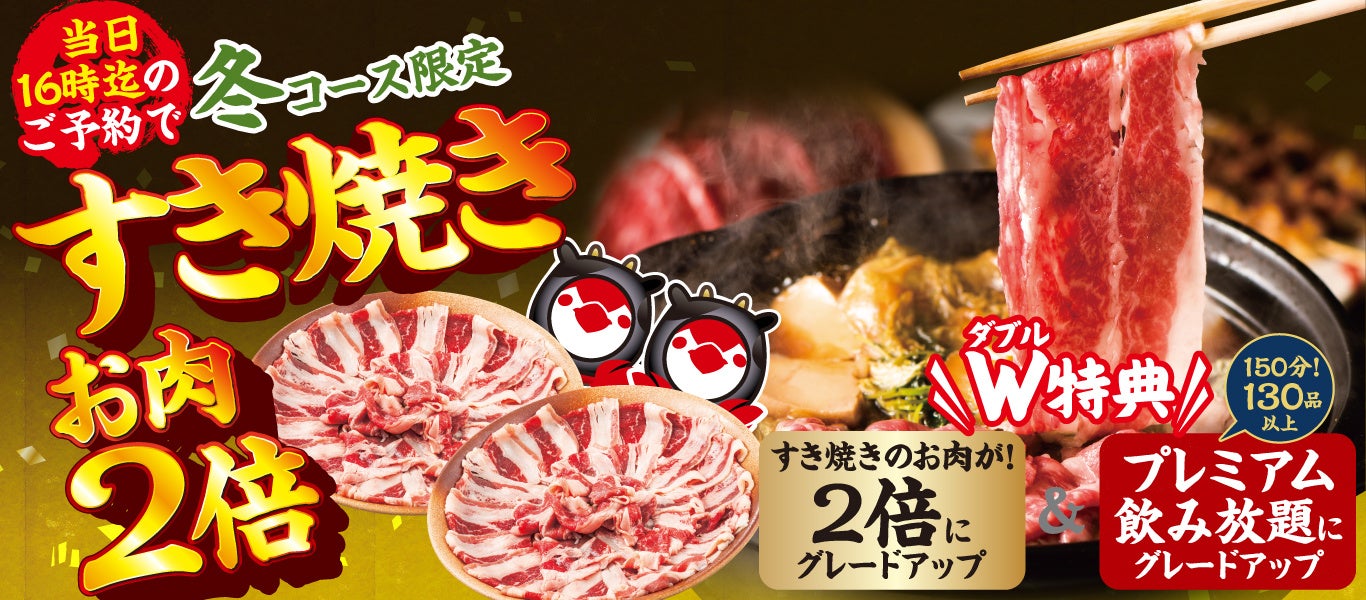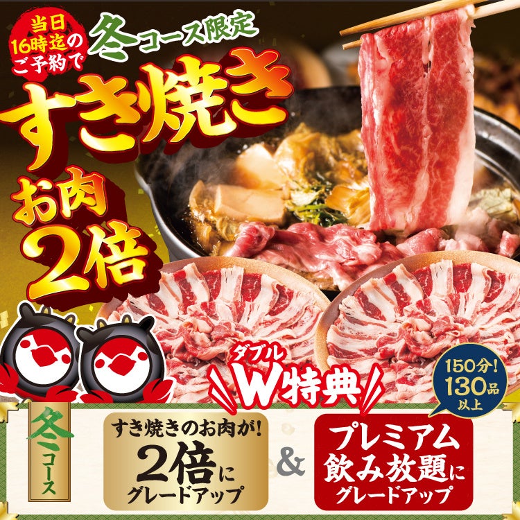 期間限定の「冬コース」では、メインのすき焼きのお肉を通常の2倍盛りに倍量し、さらに150分プレミアム飲み放題が付くダブル特典をご用意。また、鳥メロ定番の「鳥メロコース」ではフライドポテト&枝豆食べ放題と150分プレミアム飲み放題のダブル特典が付くお得なコースとなっております。