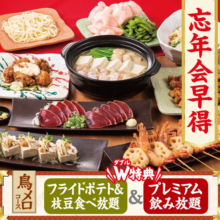 居酒屋業態「三代目 鳥メロ」(以下、鳥メロ)において、12月2日(月)から1月31日(金)の期間限定で、当日16時までのご予約で、ダブル特典が付くお得な宴会コースを提供いたします。