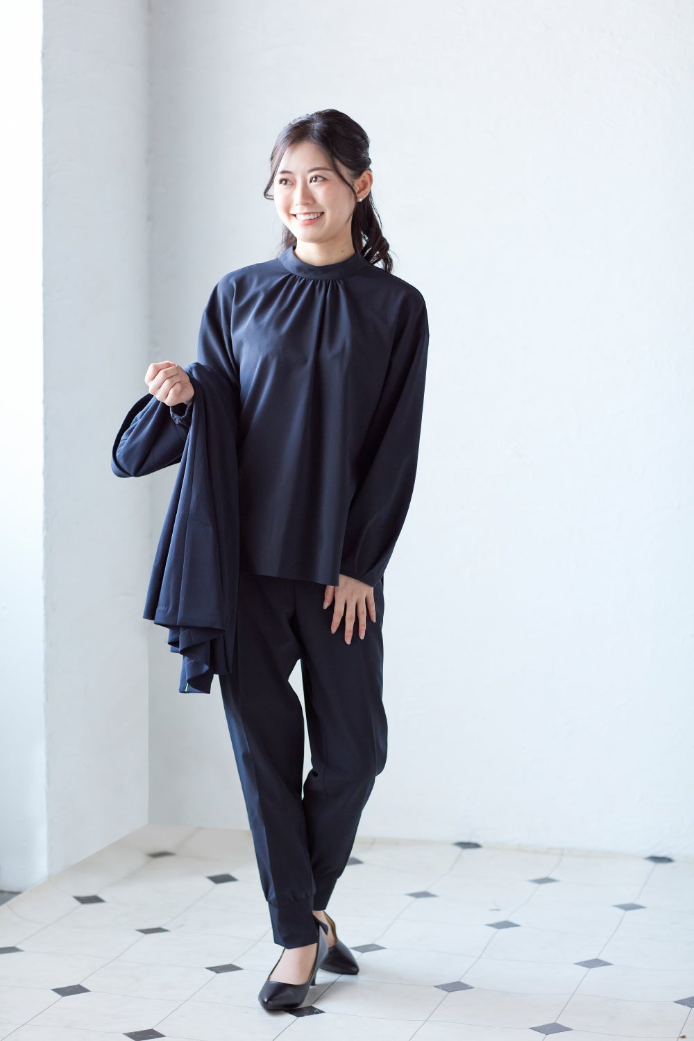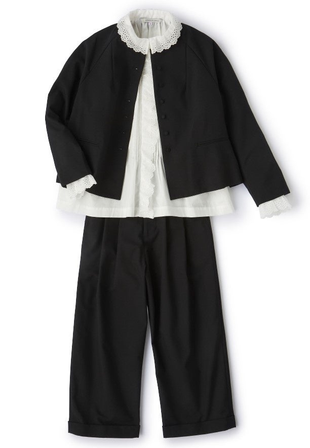 ノーカラーの襟元、小さなボタンが格を感じさせるジャケットと、八分丈のワイドパンツの組み合わせ。着回しやすいセットアップスーツに、フェミニンなフリルやギャザーを施したブラウスでハレ感を演出したコーディネート。肩の力の抜けた“こなれ感“でおしゃれさアップ。