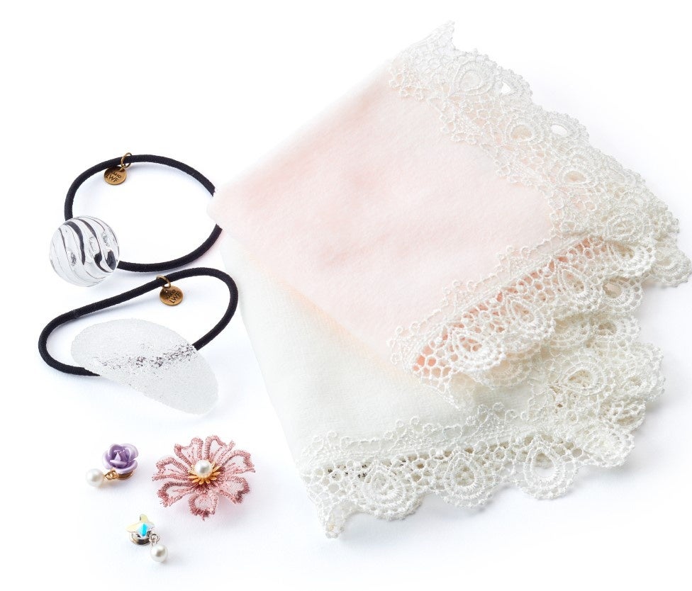おしゃれ度がアップするヘアゴムや、マスクに華やかさを添えてくれるマスクピアス、レースが映えるハンカチなど。