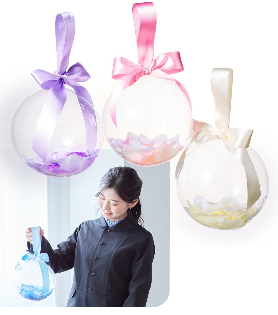 風船にお花やリボンを閉じ込めてつくります。花束よりも長持ちし、見映えもするので、卒業・卒園のお祝いシーンに近年人気が高まっています。