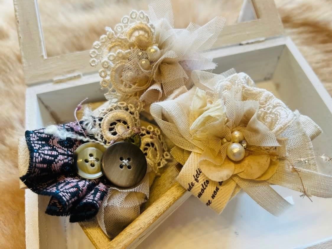 大切な記念日の装いにあわせて、レースやフリルにパールなど、お好みのパーツを組み合わせた「コサージュ」を手づくりします。
