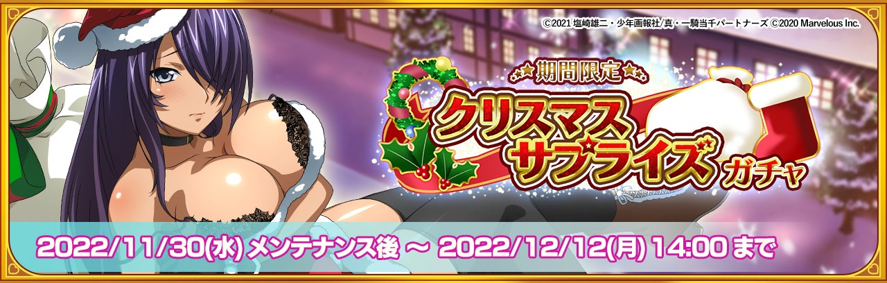 株式会社マーベラス(代表取締役社長 佐藤澄宣/所在地:東京都品川区)は、大人気シリーズ「一騎当千」のAndroid/iOS向け新作ゲームアプリ『一騎当千エクストラバースト』で、2022年11月30日(水)からシナリオイベント「愛と正義!イブのプレゼント大作戦」を開始したことをお知らせいたします。
