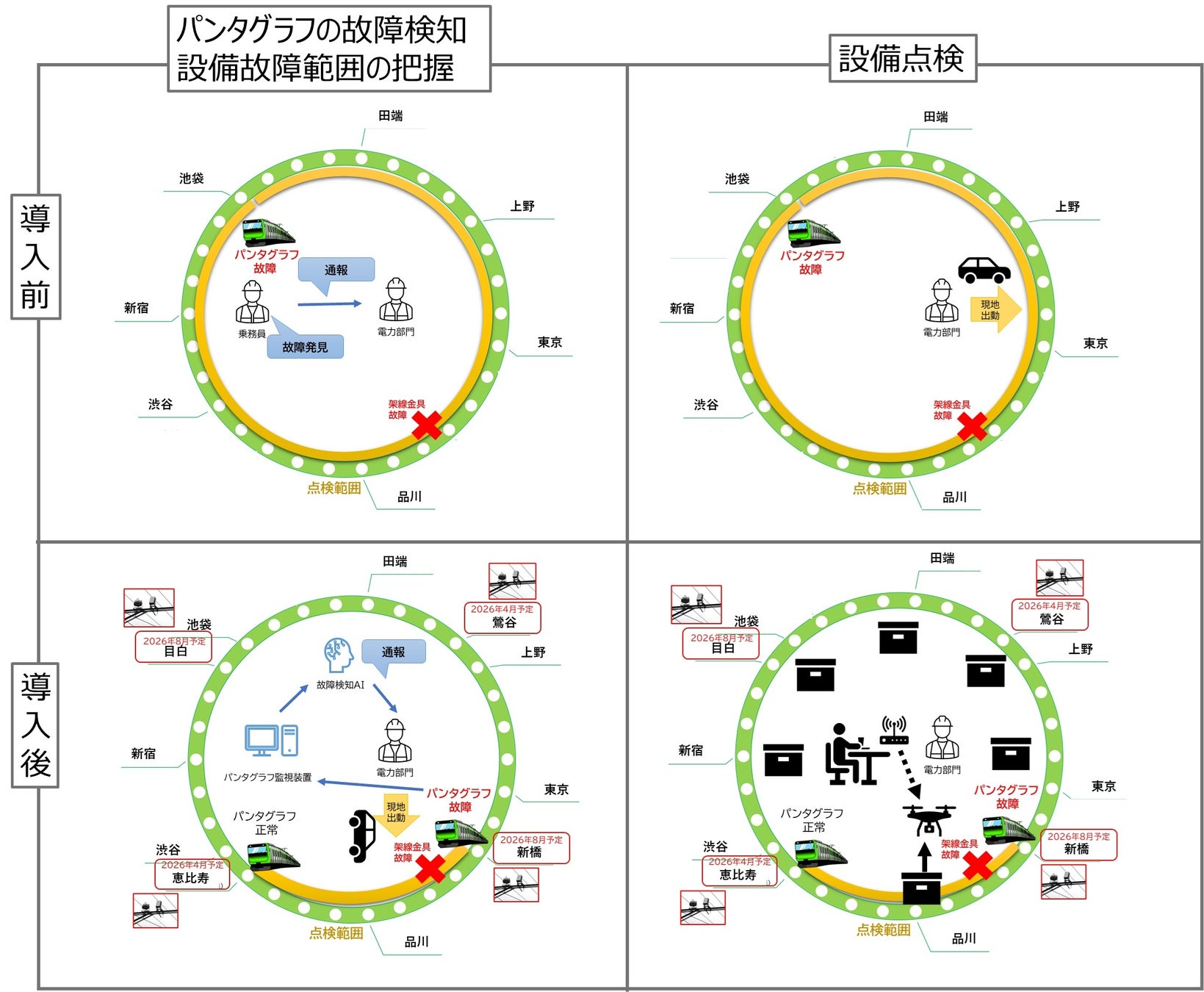 ○このたび2026年度から、山手線にパンタグラフ監視カメラを導入し、AIによる画像解析によりパンタグラフの状態のモニタリングを開始します。さらに、遠隔操作かつ鉄道敷地外飛行を防ぐ安全システムを搭載したドローン点検を導入することで、電気設備の故障箇所特定に要する時間や設備点検時間の短縮、設備損傷の拡大防止を図り、従来に比べて運転再開までの時間を約30%短縮することを目指します。都市部の鉄道敷地内で安全システムを搭載したドローンを導入するのは日本初です。