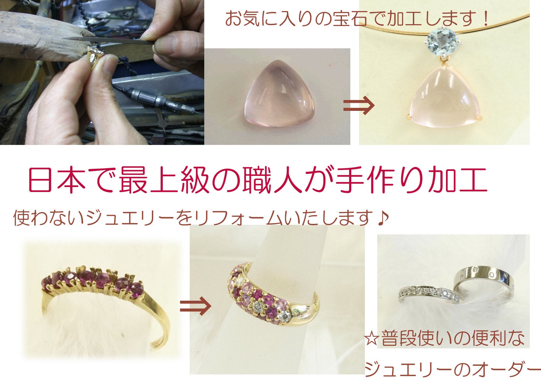 元の形を生かしたリフォームが得意。5万円以下の低予算リフォームに力を入れているため、気軽にジュエリーリフォームを依頼できる。