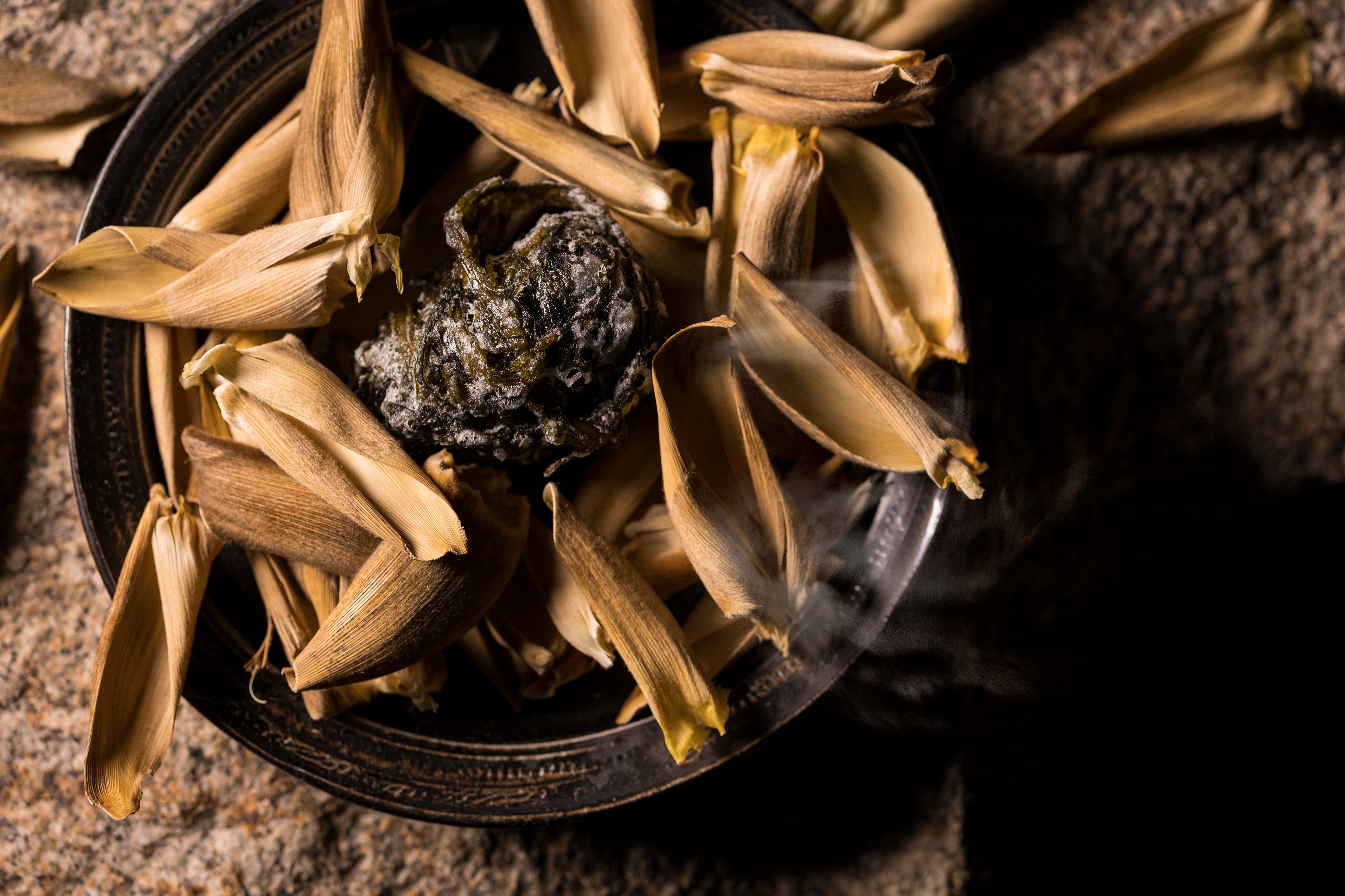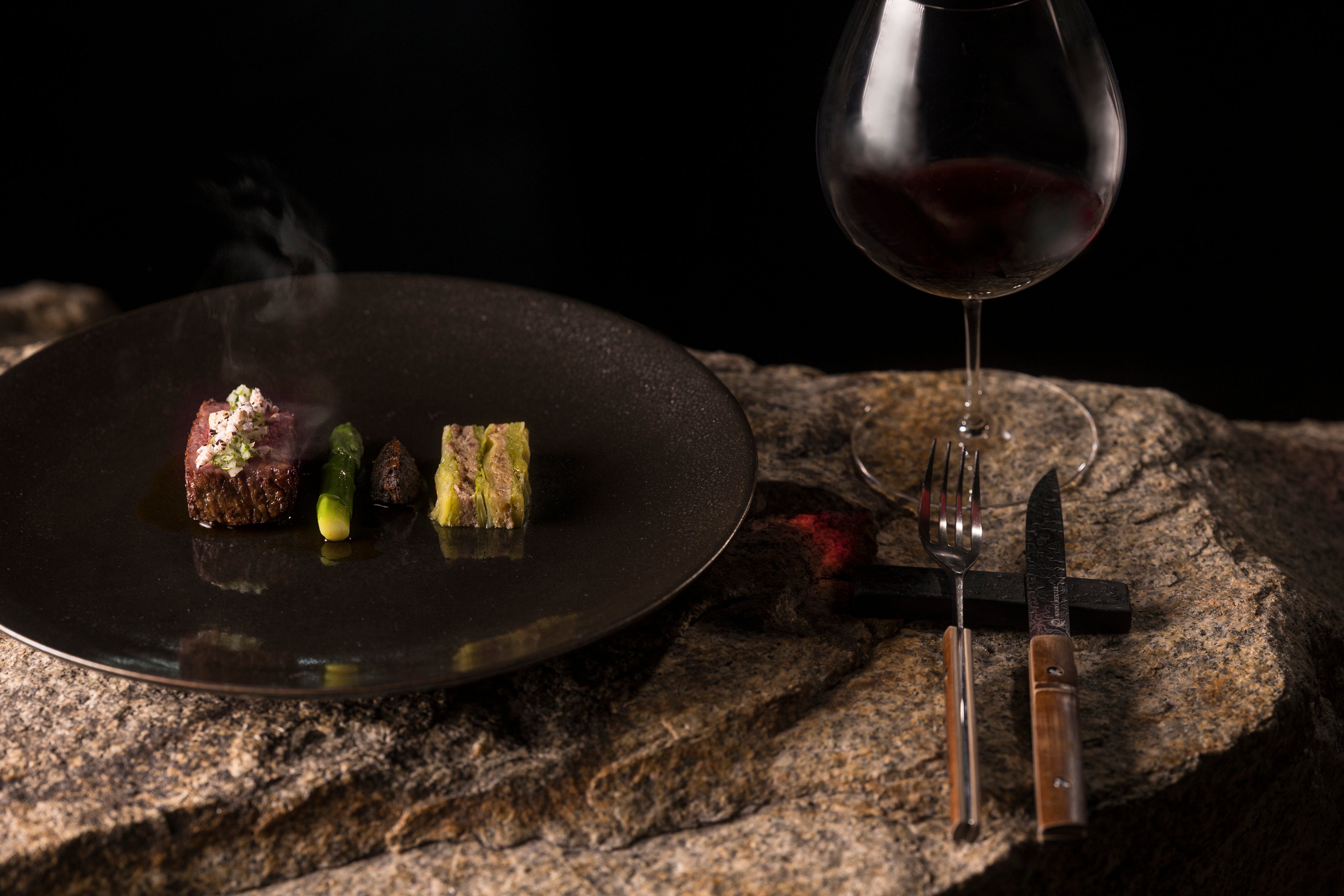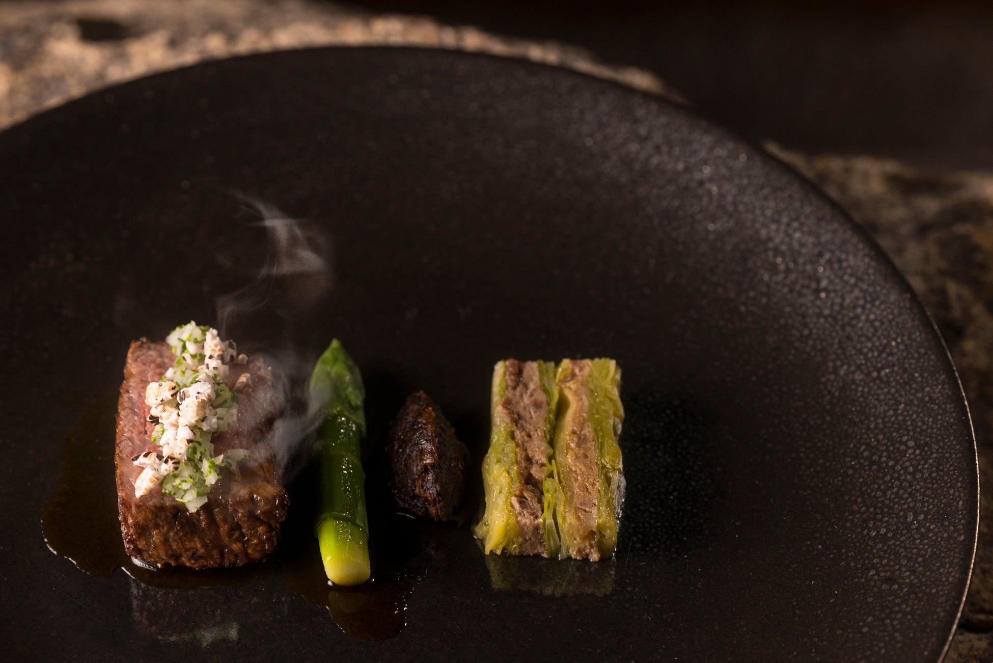 メインの肉料理には、滋賀の伝統発酵食「鮒ずし」の飯(*1)に漬け込み、芳醇な風味を纏わせた牛肉で仕立てた、ミルフィーユ状の「シューファルシ(*2)」を添えます。鮒ずしならではの酸味と旨味が、牛肉の味わいを引き立てます。古き良き滋賀の食文化と、独創的な発想が融合した一皿です。