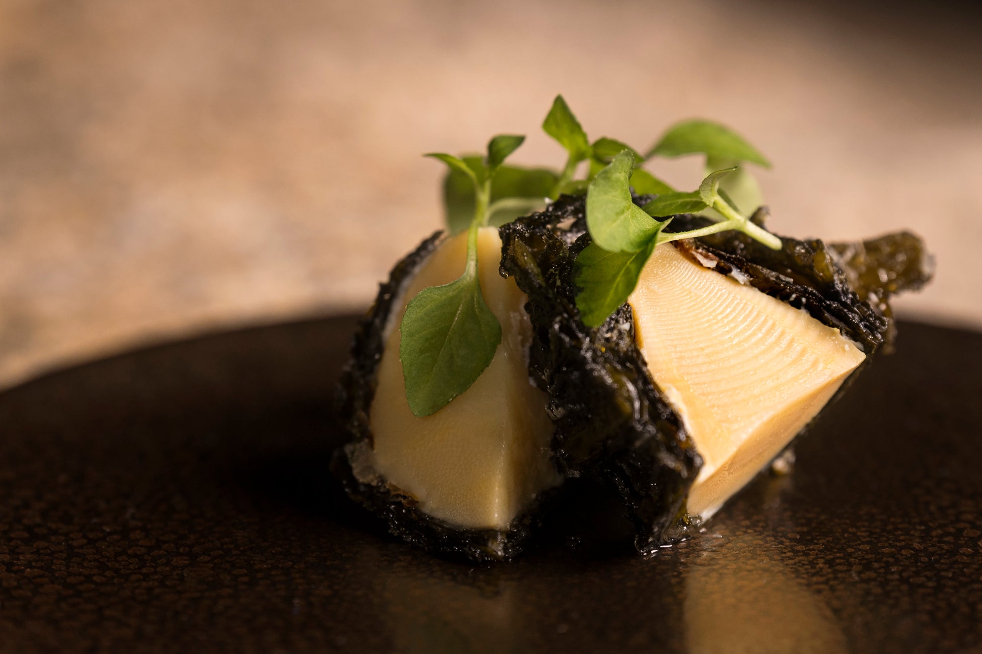 春の代表的な日本料理「若竹煮」をモチーフにした一品です。出汁で丁寧に炊き上げた筍に、春先に芽吹く香り豊かな新芽のわかめを纏わせ、軽やかなフリットに仕立てました。節に入れた帆立のムースが、筍本来の味わいに奥行きを加えます。