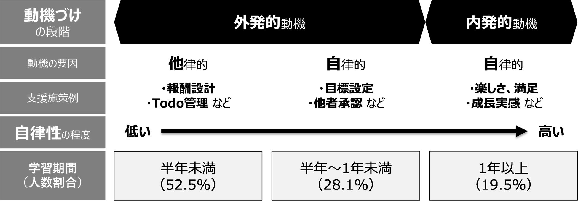 次に、3つの学習者層の特徴を動機づけ理論に基づき構成員の割合を確認した結果(図7)、構成員の約半数を占める「利用期間が短い(半年未満)従業員」の主な動機づけ要因は「外発的動機(他律的)」であると考えられた。