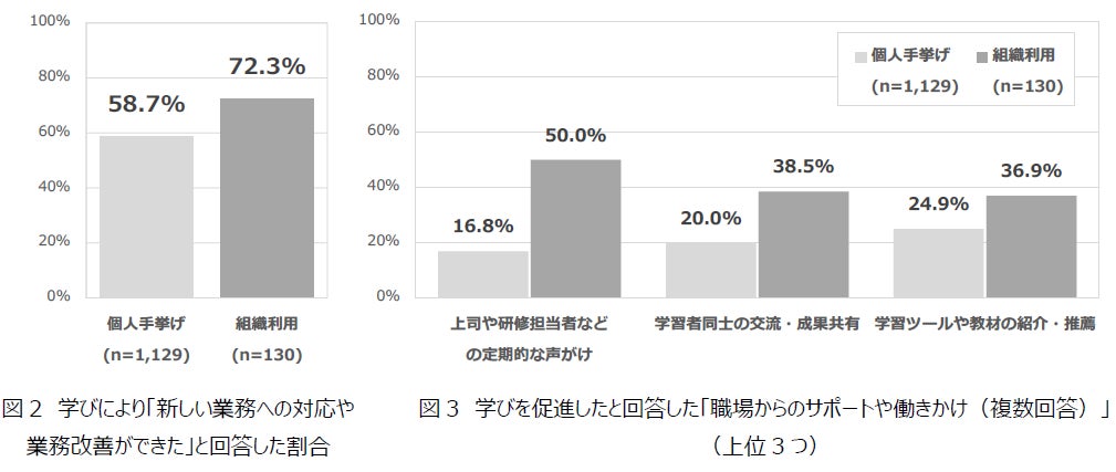 個人手挙げよりも組織利用の方が、学びにより新しい業務対応や改善ができたという「学びの業務活用実感」を持つ割合が多い(図2)。