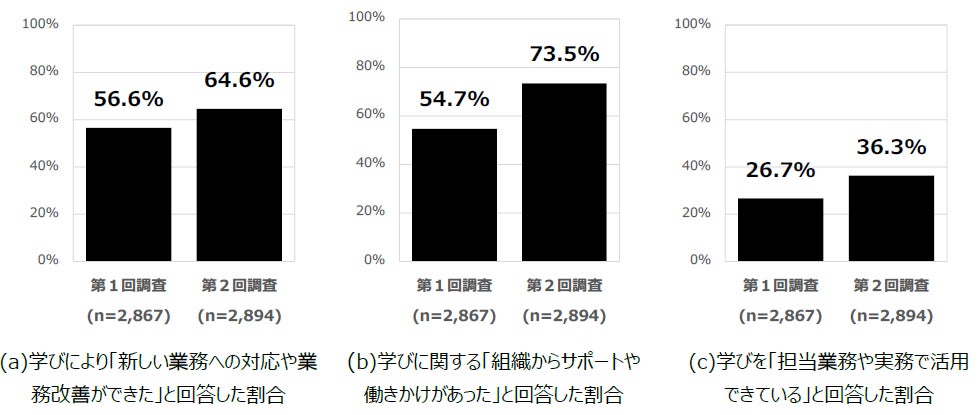 第1回調査と比べ第2回調査では、学びに関する「組織からサポートや働きかけがあった」(図4b)、学びを「担当業務や実務で活用できている」(図5c)、と回答した割合がそれぞれ増加した。