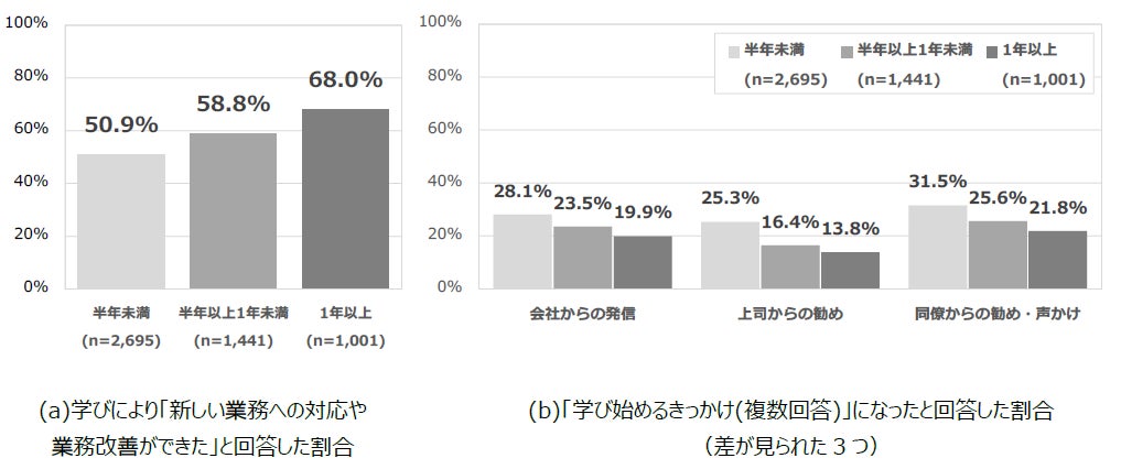従業員の業務活用実感の低下は、学習者の拡大に伴い、学習の動機づけが多様化したことが要因の一つであると考えられた(図1参照)。そこで、要因分析をするため、まず、利用開始期間に沿って3つの学習者層に分類したうえで、「学びの業務活用実感」ならびに「学び始めるきっかけ」について調べた。結果、利用期間が長いほど「学びによる業務活用実感」を持つ割合が高く(図6a)、「会社からの発信」「上司などの定期的な声かけ」「同僚からの勧め・声かけ」といった、職場での発信や声かけは利用期間が短いほど影響していることが分かった(図6b)。