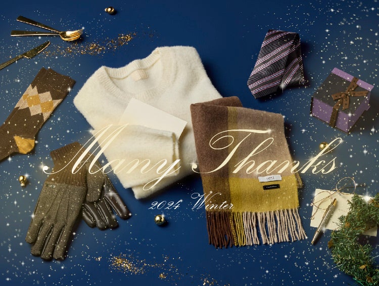 今年のクリスマスギフト特集ページ『MANY THANKS 2024』では、マフラーやネクタイ、お財布からニットまで、豊富なバリエーションで全ての年代の方にに楽しんでいただけるギフトに最適なアイテムを提案。