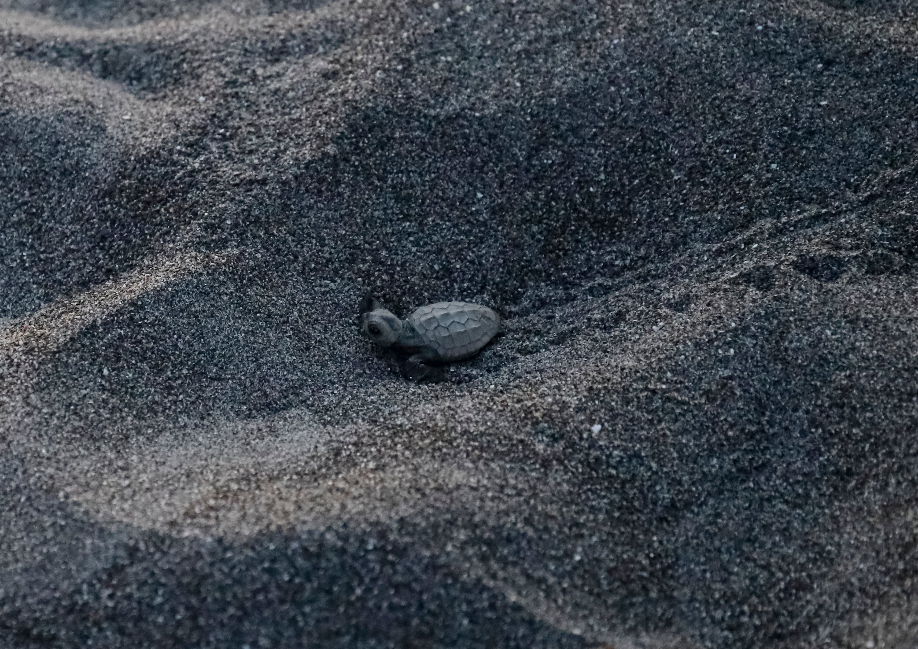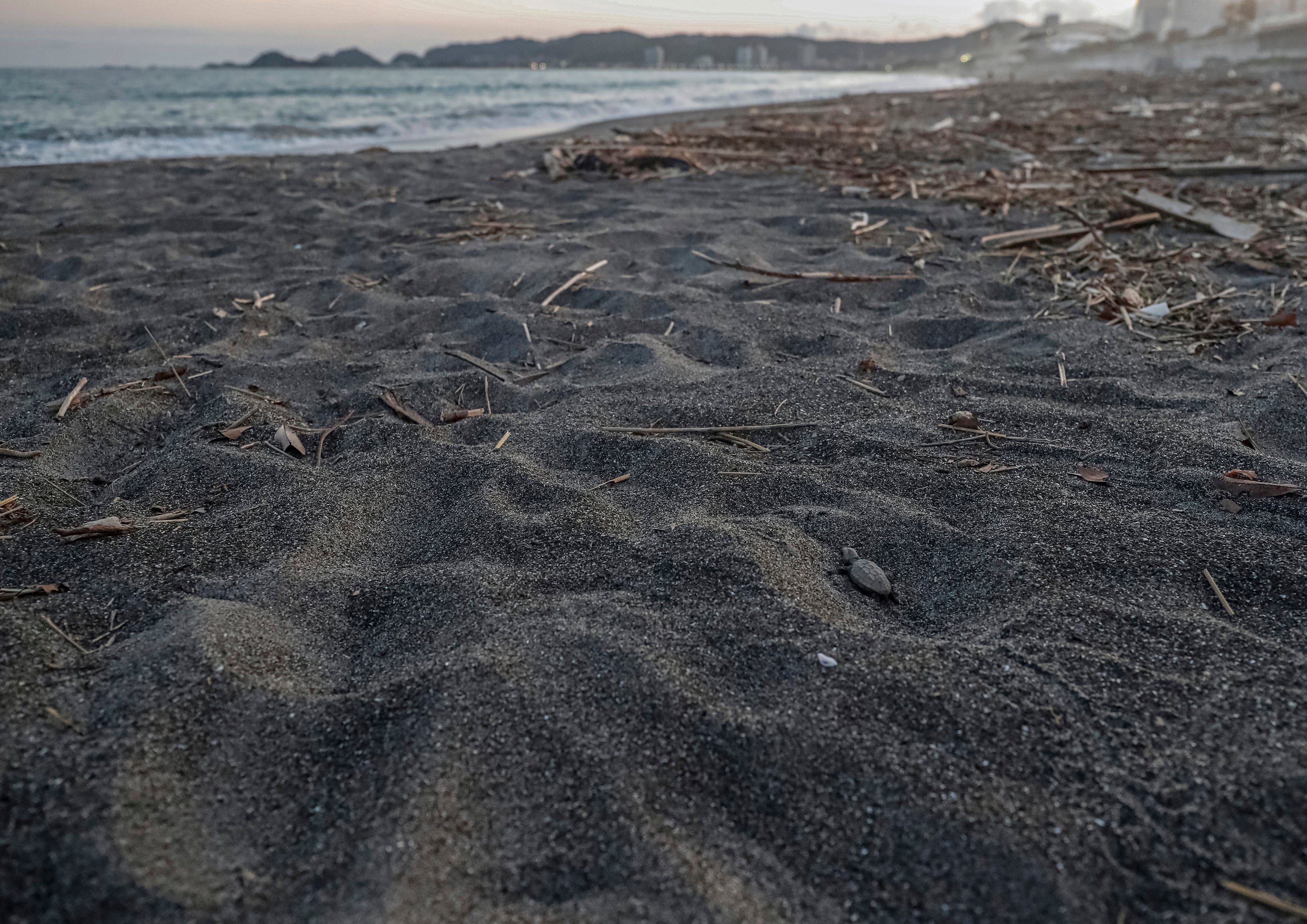 9月16日の朝に砂の中から這い出してきた4個体の子ガメたちは、甲長や体重の計測をし、放流後の生存率が高まるとされる夜に沖合へ到達できるよう夕刻に放流されました。史上最も暑いとされる酷暑を乗り越えて誕生した子ガメたちは、目の前の太平洋に向かって砂浜を力強く歩み、飼育員の見守る中、波間に姿を消していきました。