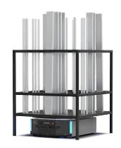 1t(トン)までの高重量物を運搬可能なリフトアップタイプの自動搬送機です。搬送物に合わせて移載棚を柔軟に変更できるため、長尺な建材も搬送可能です。