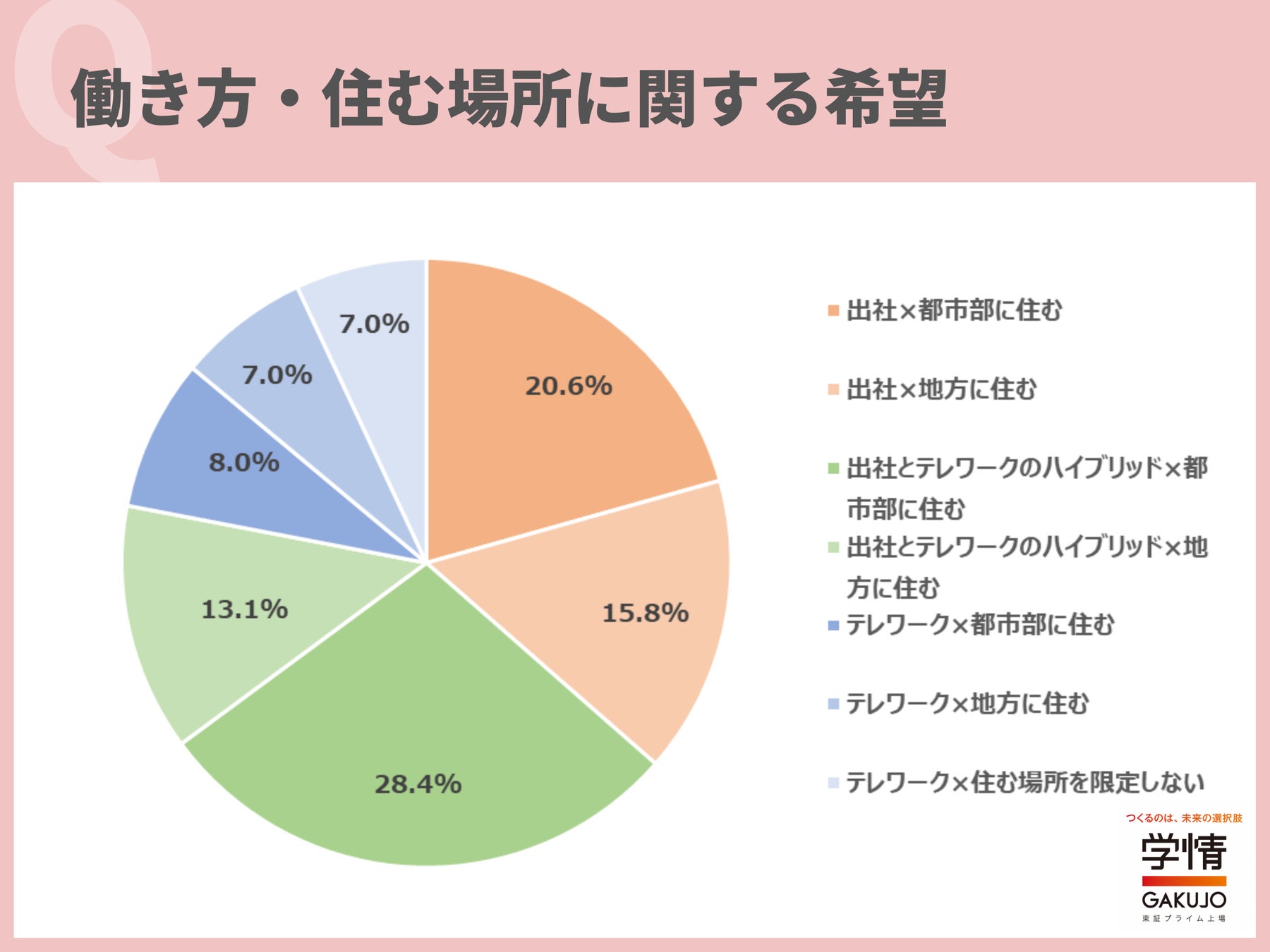 株式会社学情(本社:東京都中央区)は、20代の仕事観や働く意識をひも解くために、アンケート調査を実施しました。今回は、「住む場所・働き方」に関して調査。「住む場所・働き方」について、「都市部に住む×出社とテレワークのハイブリッド」と回答した20代が28.4%で最多となりました。次いで、「都市部に住む×出社」が20.6%で続いています。「住む場所」別に見ると、「都市部」に住むことを希望する20代が57.0%、「地方」に住むことを希望する20代が35.9%となりました。「都心のほうが仕事の幅が広く、やりたいと思ったことが制限なくできそう」「都市部には、成長性や収入の面で魅力的な企業が多いと思う」といった声が寄せられました。「働き方」別では、「出社とテレワークのハイブリッド」が41.5%で最多。次いで「出社」36.4%、「テレワーク」22.0%が続きました。