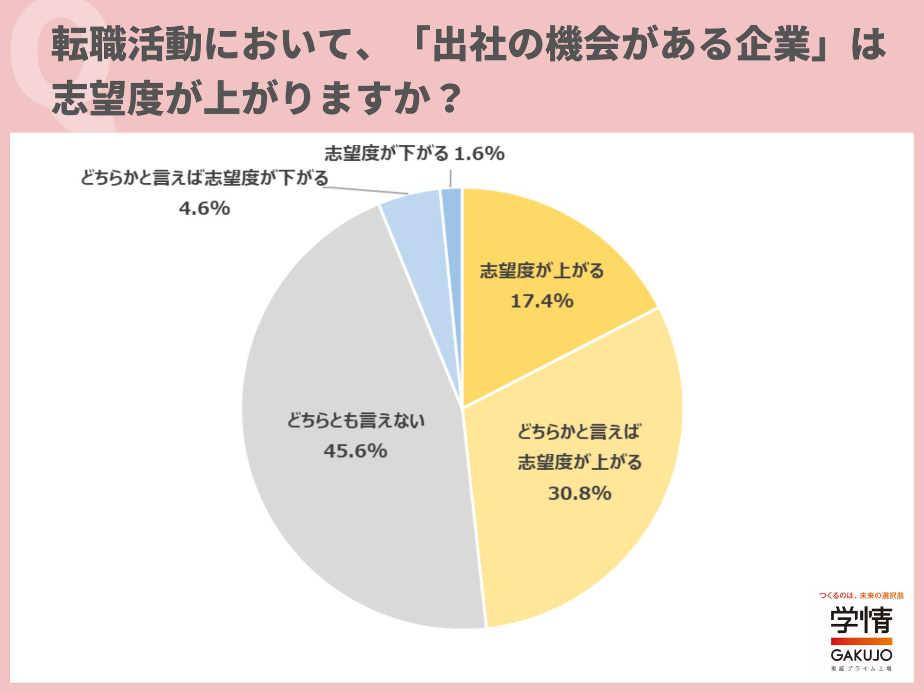 転職活動において、「出社の機会がある企業」は「志望度が上がる」と回答した20代が17.4%に上りました。「どちらかと言えば志望度が上がる」30.8%を合わせると、約半数の20代が「出社の機会がある企業は、志望度が上がる」としています。「リモートワークが中心だとしても、週に何度かは出社したほうが円滑にコミュニケーションを図れると思う」「実際に会うことで信頼関係を築くことができると思う」「20代のうちは、対面でコミュニケーションをとりながら仕事を学んでいくほうが成長できると思う」「質問や自宅でやりにくい業務が発生した場合は、出社できるほうが好ましい」といった声が寄せられました。