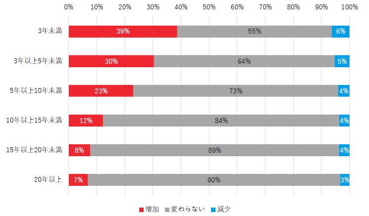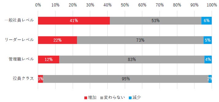 さらに、離職者の状況を階層別に聞いたところ、組織階層が下位レベルの従業員、入社年次が若い従業員ほど、「増加」が大きい結果となりました。日本における増加傾向は、終身雇用という概念が薄れ、特に若年層で転職によるキャリアアップやスキルアップを志向する傾向が広まっていることが大きな理由になっていると推察されます。