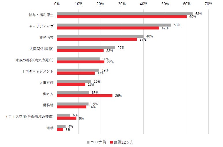 ■ 直近一年では、コロナ前に比べて「働き方」を理由に離職するケースが11ポイント上昇。企業はコロナ禍によって多様化する「働き方」に対する柔軟な対応が求められる。