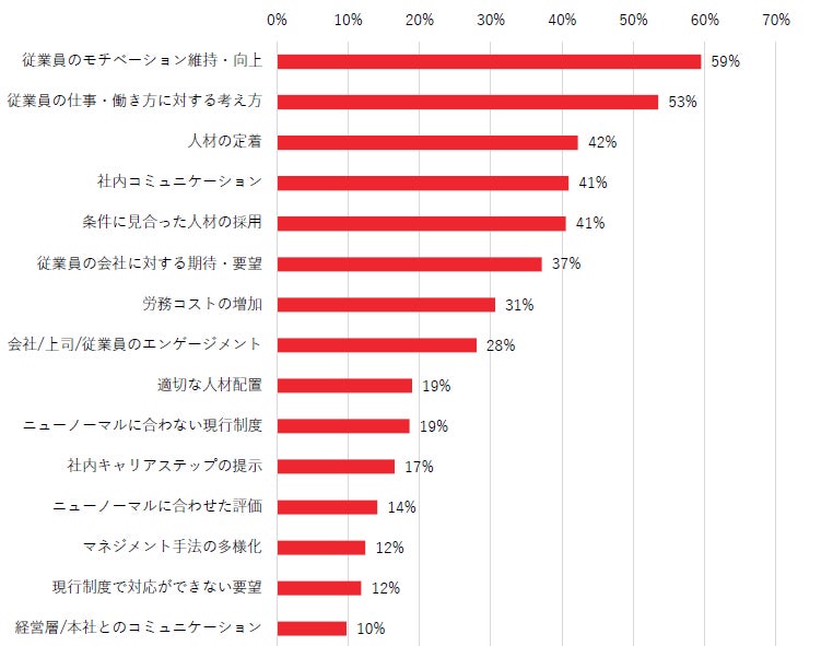 - 7割がコロナ前に比べて人材マネジメントの難化を感じている。難しく感じる点は、多くの国で「モチベーションの維持」、次いで「仕事や働き方の変化」。