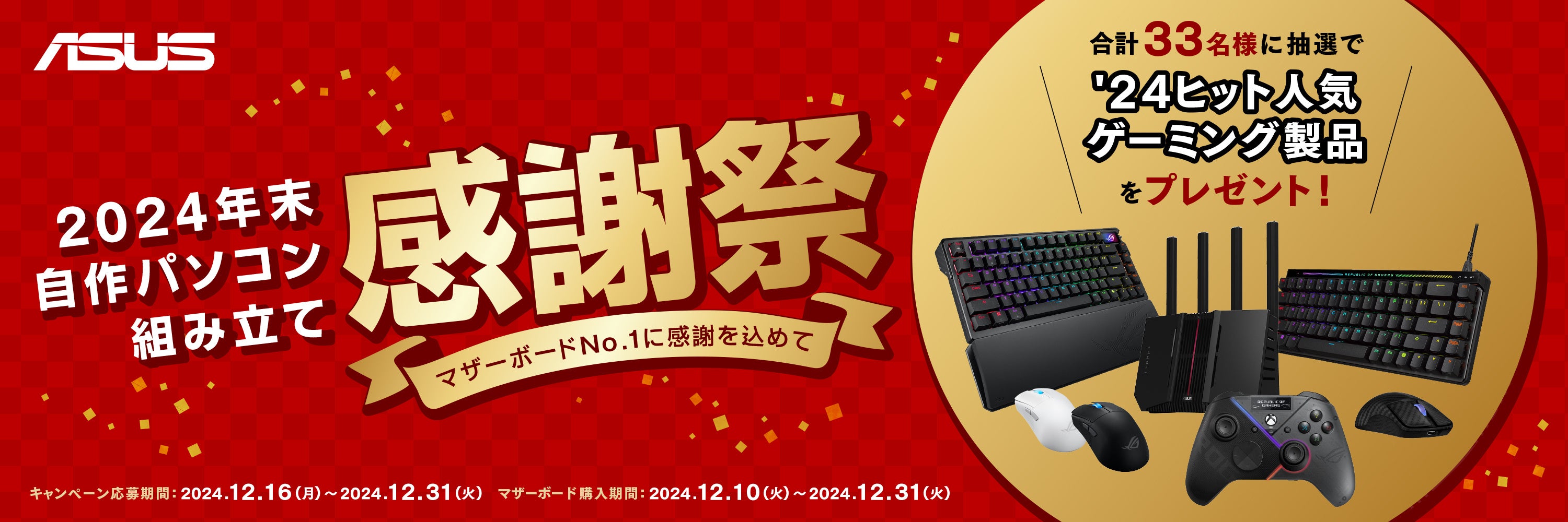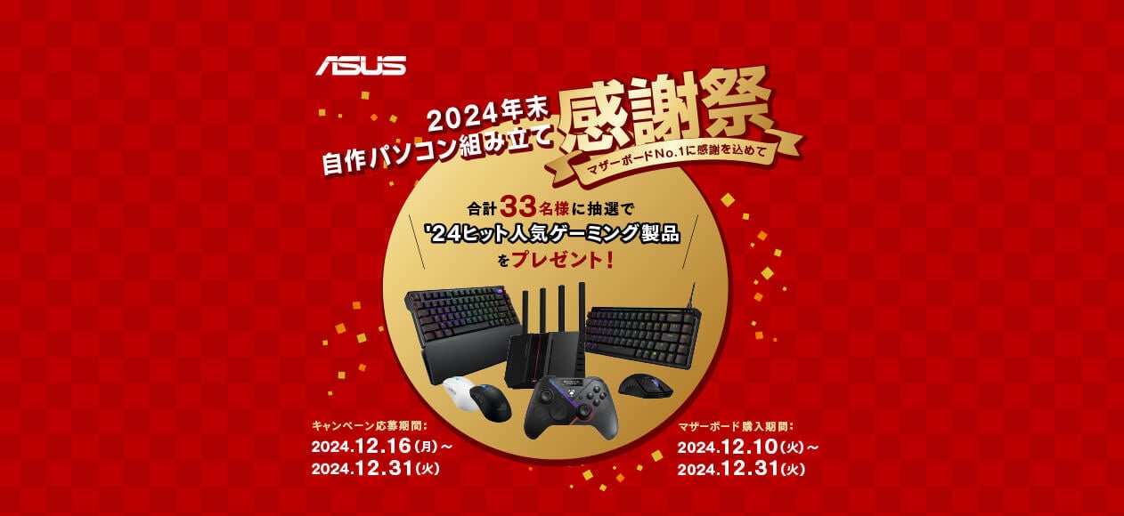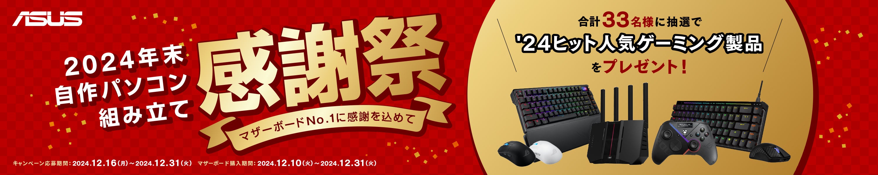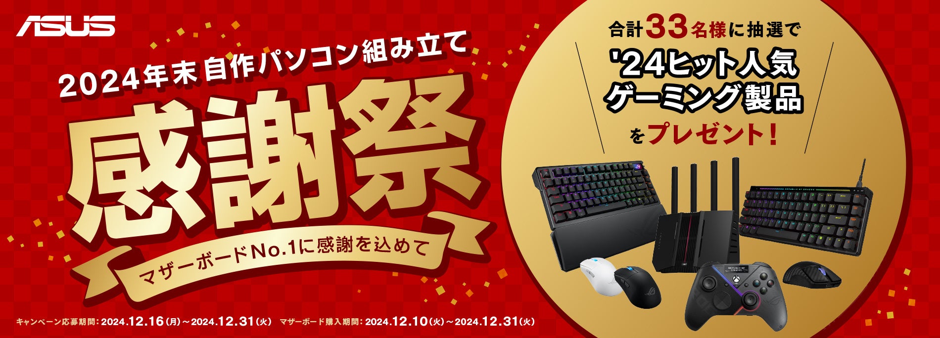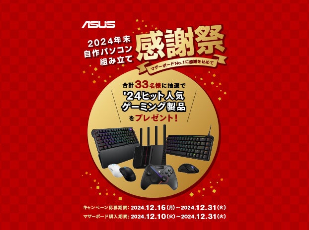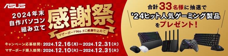 ASUS JAPAN株式会社は、2024 年末ASUS 自作パソコン組み立て 感謝祭~マザーボードNo.1に感謝を込めて~ と題し、ASUS製マザーボード購入者に抽選で合計33名様に豪華ゲーミング製品をプレゼントするキャンペーンを2024年12月16日(月)より開催します。