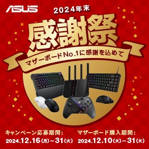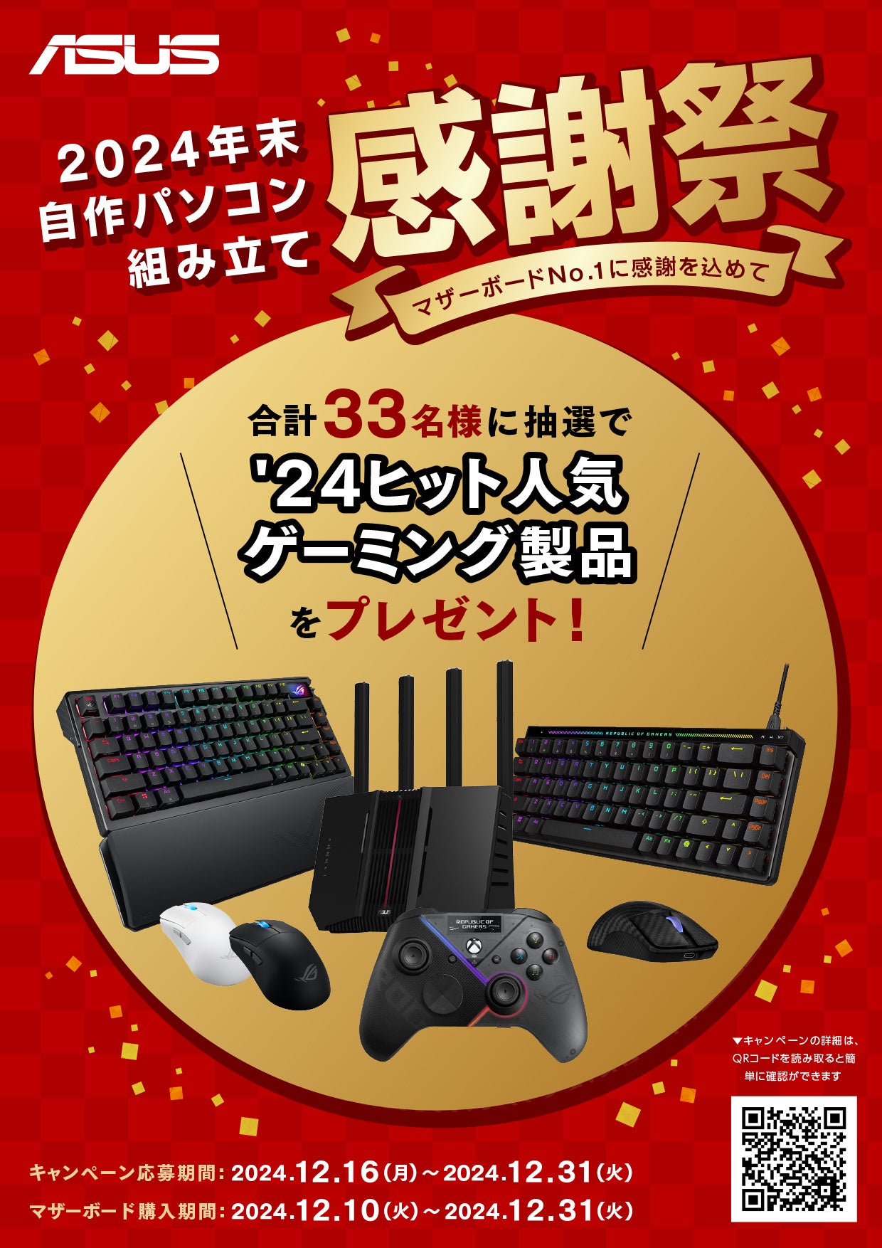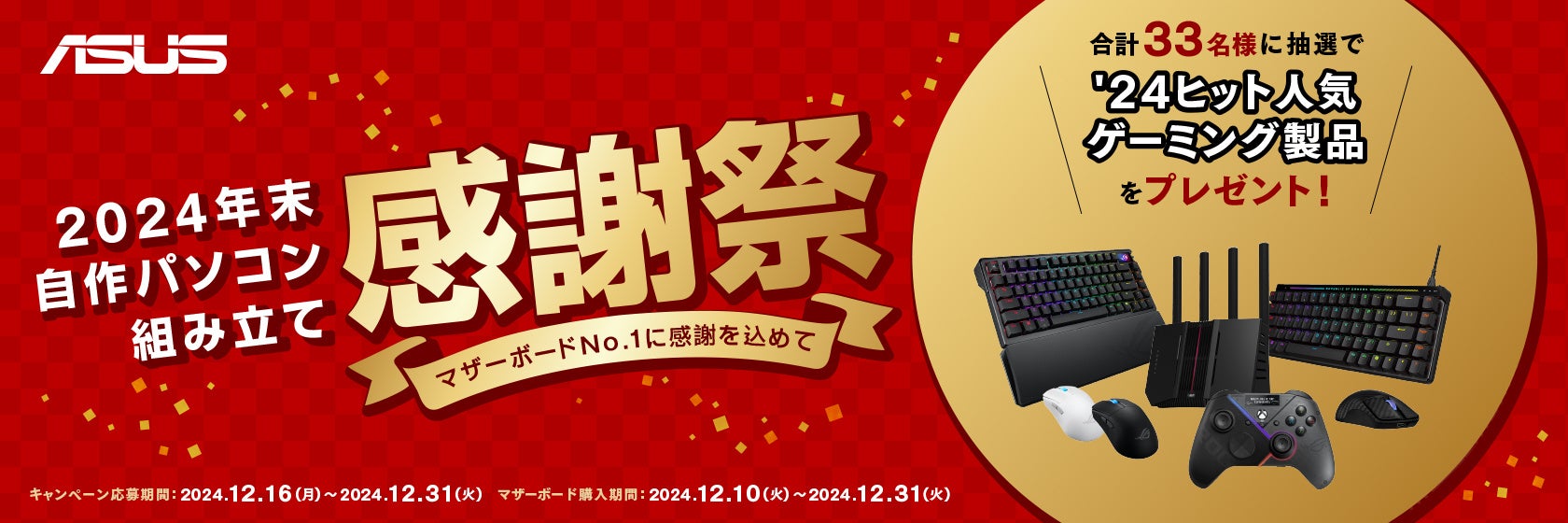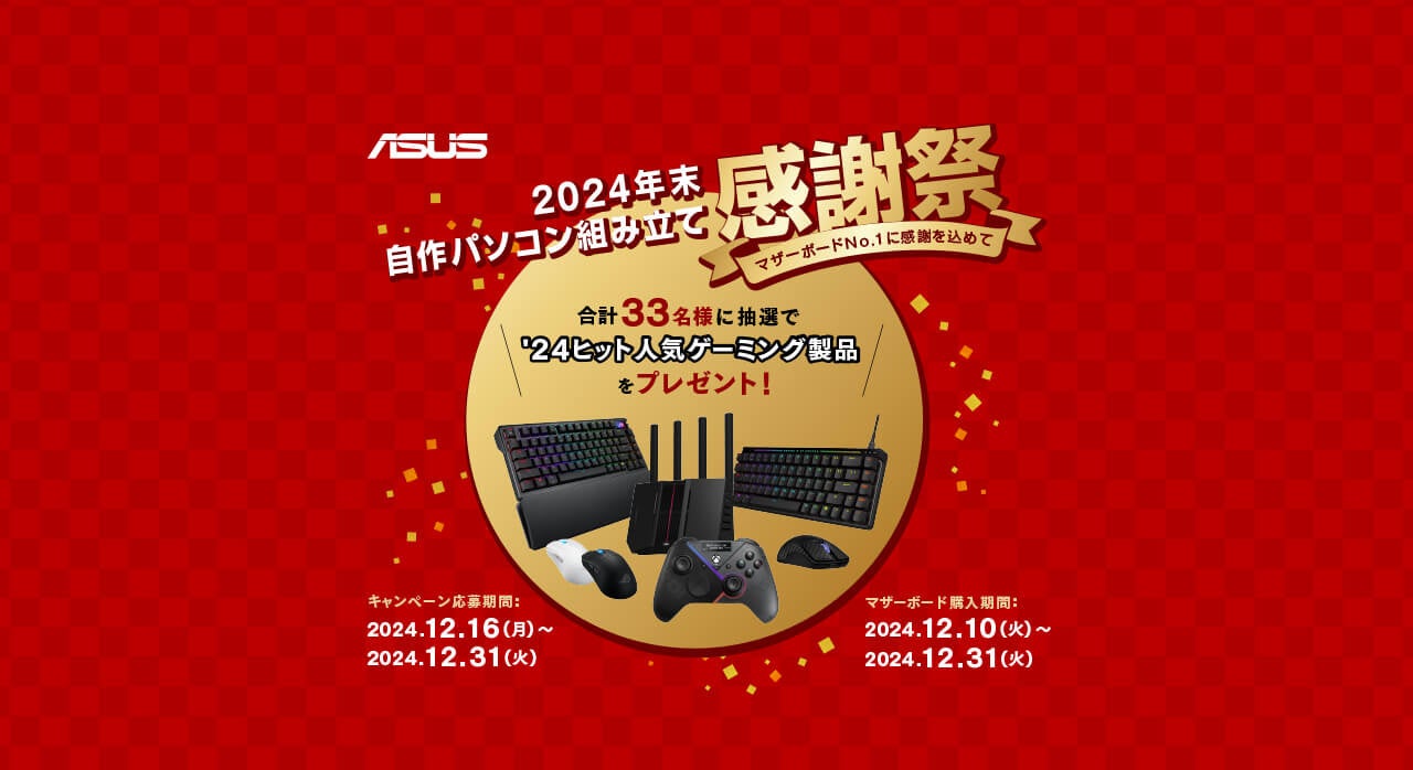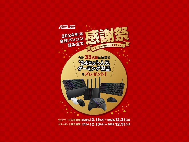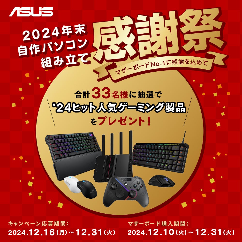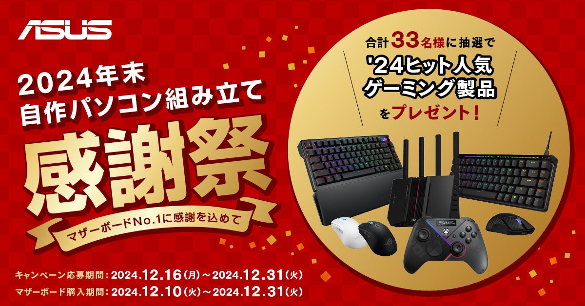ASUS JAPAN株式会社は、2024 年末ASUS 自作パソコン組み立て 感謝祭~マザーボードNo.1に感謝を込めて~ と題し、ASUS製マザーボード購入者に抽選で合計33名様に豪華ゲーミング製品をプレゼントするキャンペーンを2024年12月16日(月)より開催します。