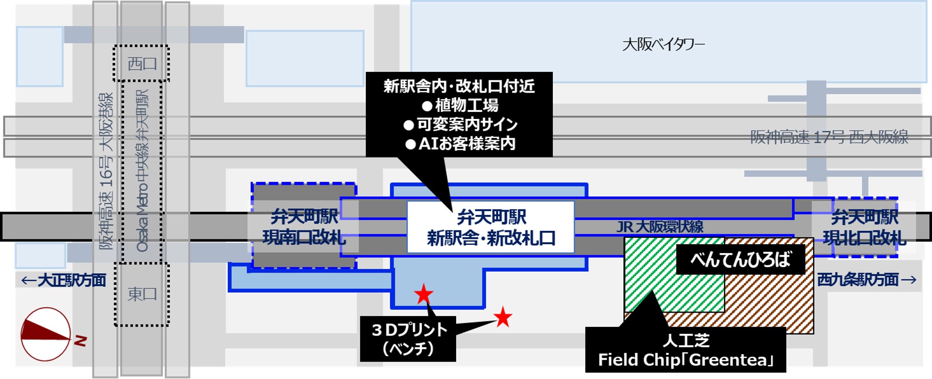 新駅舎の開業にあわせ、万博期間中の新たなにぎわい空間として駅前(旧交通科学博物館跡地)に「べんてんひろば」を新たに開業するとともに、大阪駅(うめきたエリア)を中心に進めてきたイノベーションの実験場『JR WEST LABO』※の取組みを水平展開し、新しい価値創造の拠点として生まれ変わります。