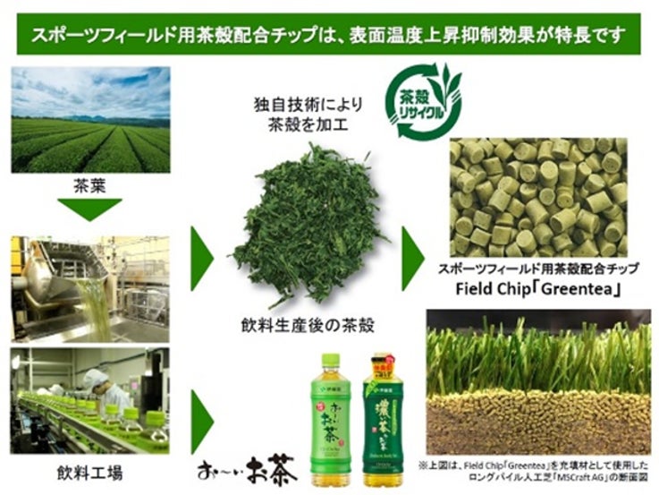 伊藤園で茶系飲料を製造時に出る茶殻を再利用しており、一般的な黒ゴムチップの充填材と比較して表面温度の上昇を抑制することに加えて、茶殻にはお茶の樹木(植物)が吸収した二酸化炭素が蓄えられているため、二酸化炭素を削減することができます。また、ゴムチップ特有のにおいがしない特長があります。