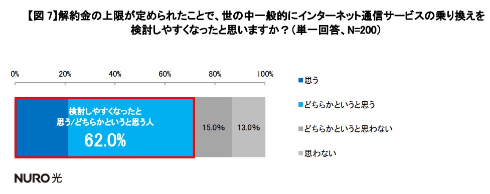 最後に、「世の中一般的に解約金の上限設定によって乗り換えがしやすくなったと思いますか」という質問に対して、6割以上(62.0%)が「思う」もしくは「どちらかというと思う」と回答しました。改めて金銭的ハードルが下がったことが、インターネット通信サービスの乗り換えを加速させるきっかけになるという期待感が高いことが明らかになりました。【図7】