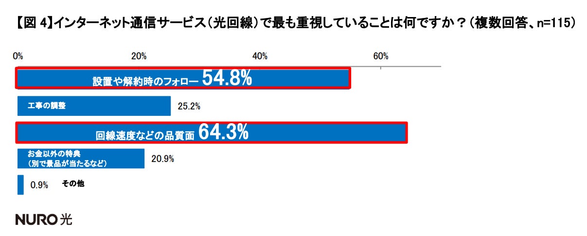 「回線速度などの品質面」(64.3%)、「設置や解約時のフォロー」(54.8%)。