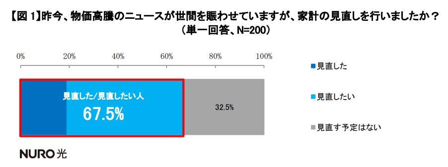 物価高騰の中、家計を見直した、見直したい人は調査対象者のうち3人に2人以上(67.5%)。