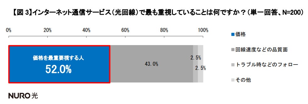 インターネット通信サービス(光回線)で最も重視することは、半数以上(52.0%)が「価格」と回答。
