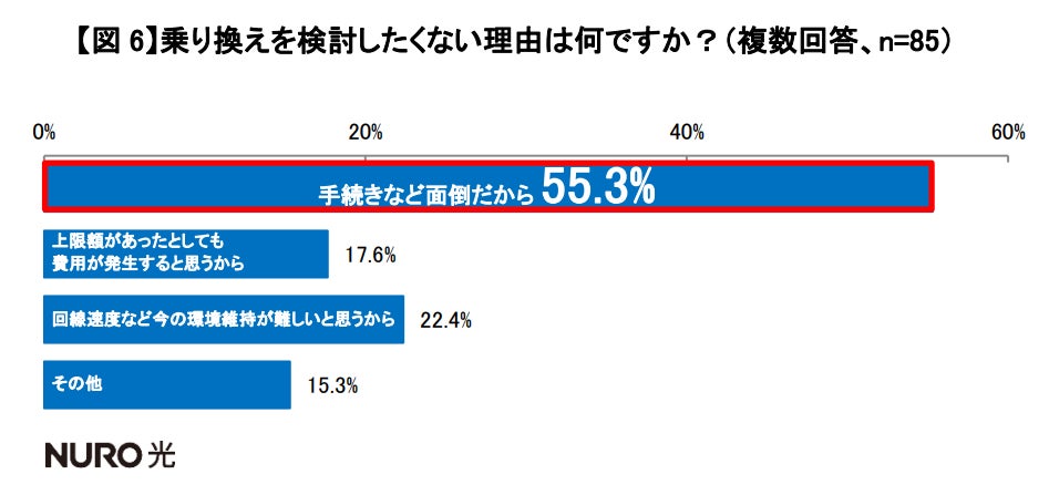 なお、今回の解約金の上限が設けられてもインターネット通信サービスの乗り換えは検討しないと回答した人たちへ乗り換えの障害になっている理由を聞いたところ、半数以上(55.3%)が「手続きなどが面倒だから」と回答しており、その他の理由とは大きな差が出る結果となっています。【図6】