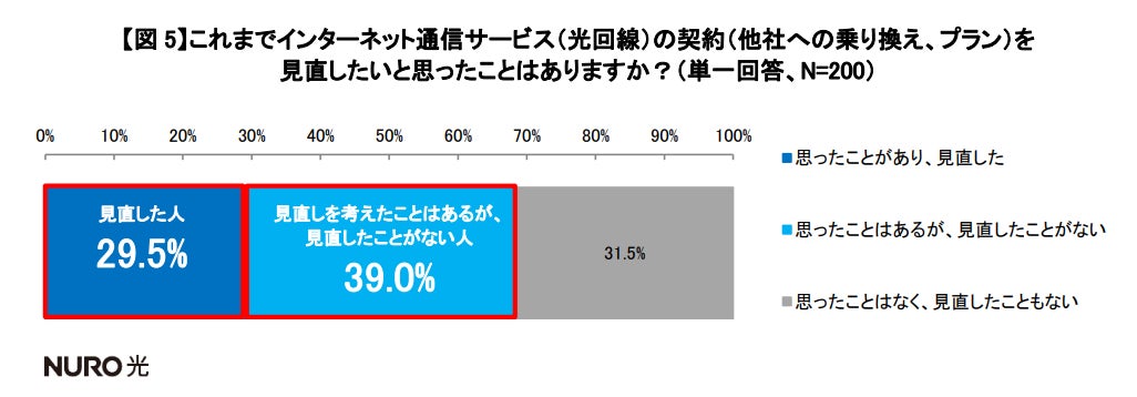 乗り換えが加速化しそうな中で、調査対象者へ実際にインターネット通信サービス(光回線)の契約(他社への乗り換え、プラン)を見直したいと思ったことがあるかを聞いたところ、「思ったことがあり、見直した」のは29.5%という結果になりました。さらに、「思ったことはあるが、見直したことがない」(39.0%)が「思ったことはなく、見直したこともない」(31.5%)より多く、見直しを検討したことはありつつも、行動に移せていない人が一定数存在することが明らかになりました。【図5】