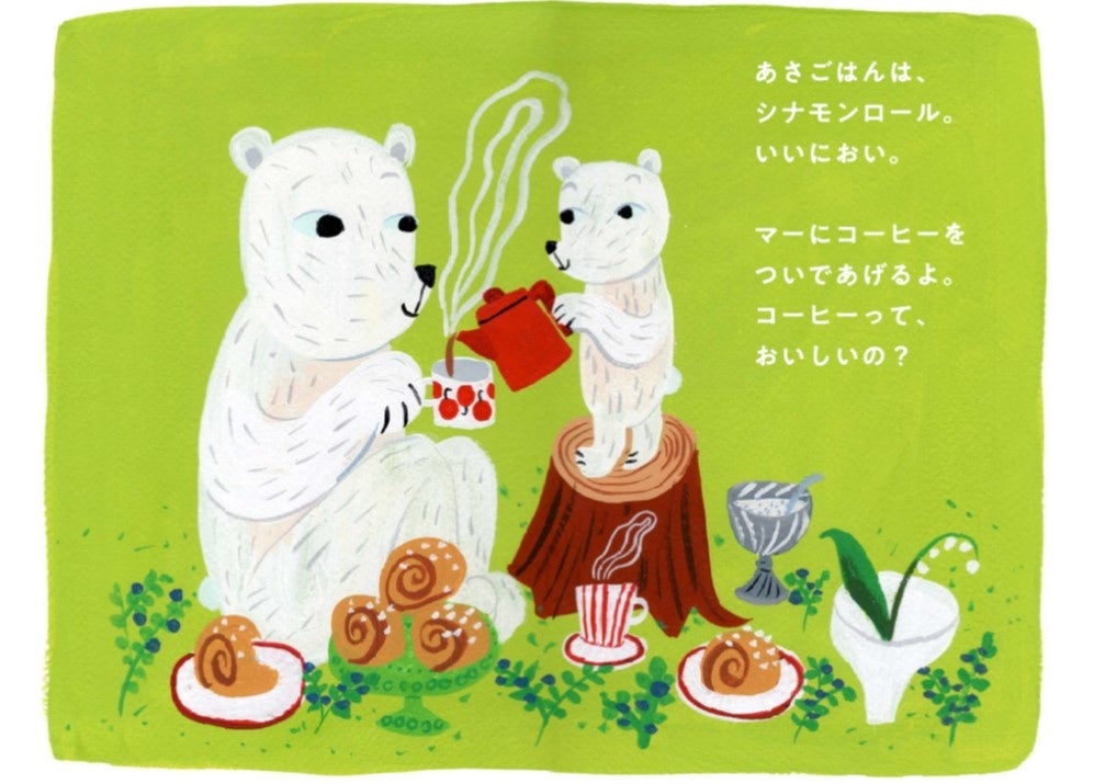 「マー&ミー ラッテ」は“わたしにも、こどもにも、うれしい。”がコンセプト。そのコンセプトをもとに、キッピスのデザイナーの一人でフィンランド出身のマッティ・ピックヤムサ氏が今回のデザインを描き下ろしました。絵本『マーとミーのおやすみのひ』は、しろくま親子の休日の「ほっ。」とするシーンが描かれています。家族で過ごす時間を大切にする北欧のライフスタイルに触れ、この絵本を手に取った方の心が温まることを願い、制作しました。