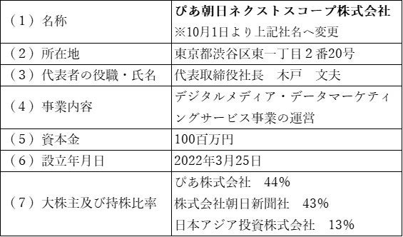 株式会社朝日新聞社(代表取締役社長:中村史郎、以下「朝日新聞社」)は、先般開示しました「ぴあネクストスコープ株式会社への出資に関するお知らせ」にて記載の通り、ぴあネクストスコープ株式会社(本社:東京都渋谷区、代表取締役社長:木戸文夫、以下「ぴあネクストスコープ」)の株式を2022年8月31日に取得しました。本株式譲渡に伴い、ぴあネクストスコープは本日臨時株主総会を開催し、下記新体制を発足しましたので、お知らせします。