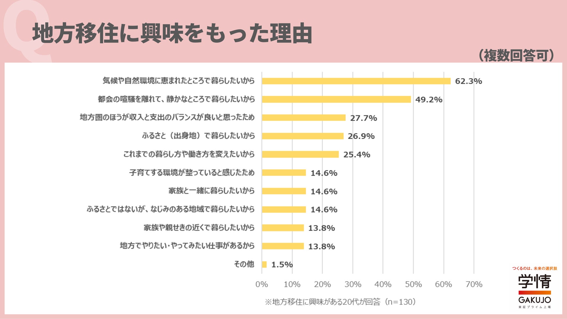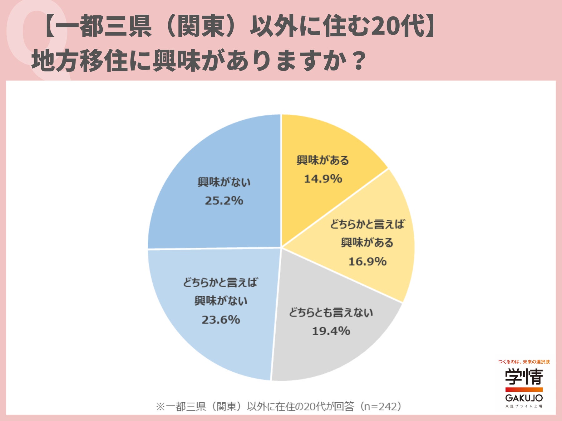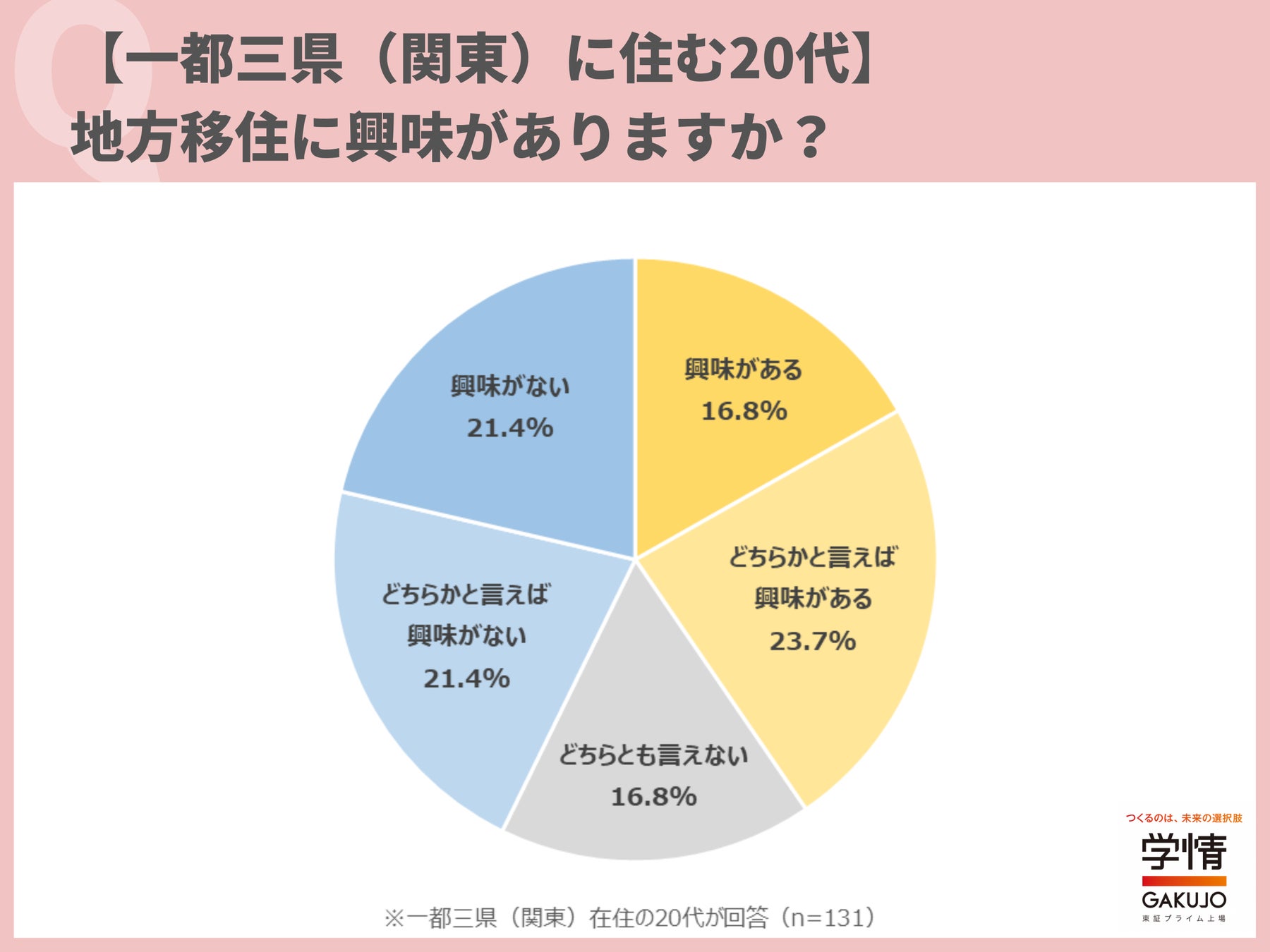株式会社学情(本社:東京都中央区)は、20代の仕事観や働く意識をひも解くために、アンケート調査を実施しました。今回は、「地方移住」について調査。地方移住に「興味がある」と回答した一都三県(関東)在住の20代が4割を超えました。一方、一都三県(関東)以外に在住の20代に同様の質問をしたところ、「地方移住に興味がある」の回答は約3割に留まりました。また、地方移住に興味をもった理由は「気候や自然環境に恵まれたところで暮らしたいから」が最多。次いで、「都会の喧騒を離れて、静かなところで暮らしたいから」、「地方圏のほうが収入と支出のバランスが良いと思ったため」、「ふるさと(出身地)で暮らしたいから」、「これまでの暮らし方や働き方を変えたいから」が続きました。