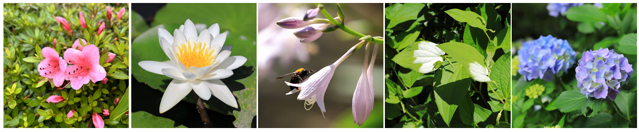 左からさつき、スイレン、ギボウシ、ハンゲショウ、アジサイ