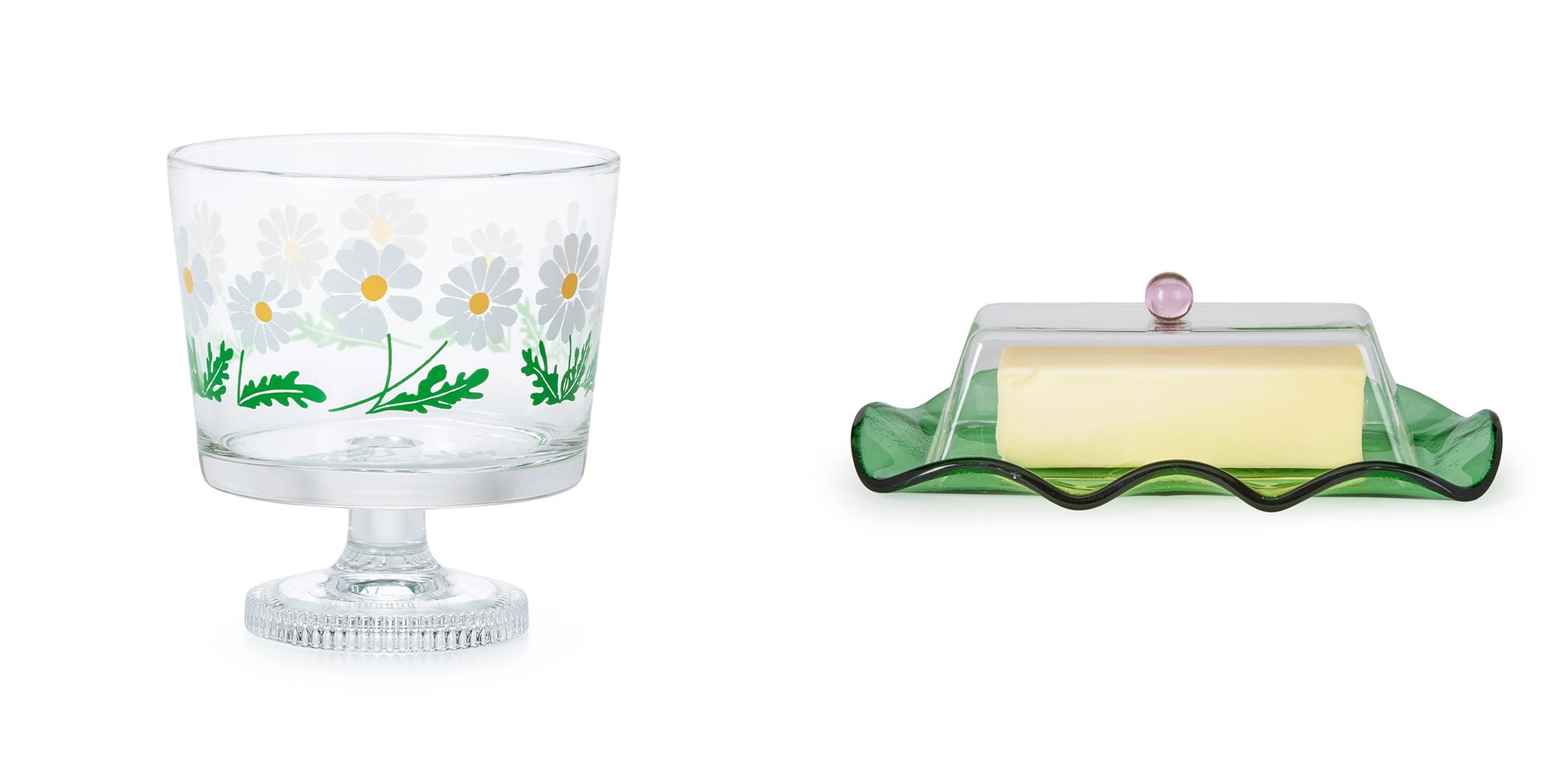 フランス系アメリカ人デザイナー、ソフィ・ルー・ヤコブセンが精巧なアートオブジェのようなバターディッシュを考案しました。バターをのせる波形のガラスにヤコブセンのトレードマークである波模様をとり入れ、ガラスカバーには上げ下げしやすいように半透明のピンクボールを付けています。フォルムの美しさと機能性を兼ね備え、テーブルに花を添えてくれるバターディッシュです。