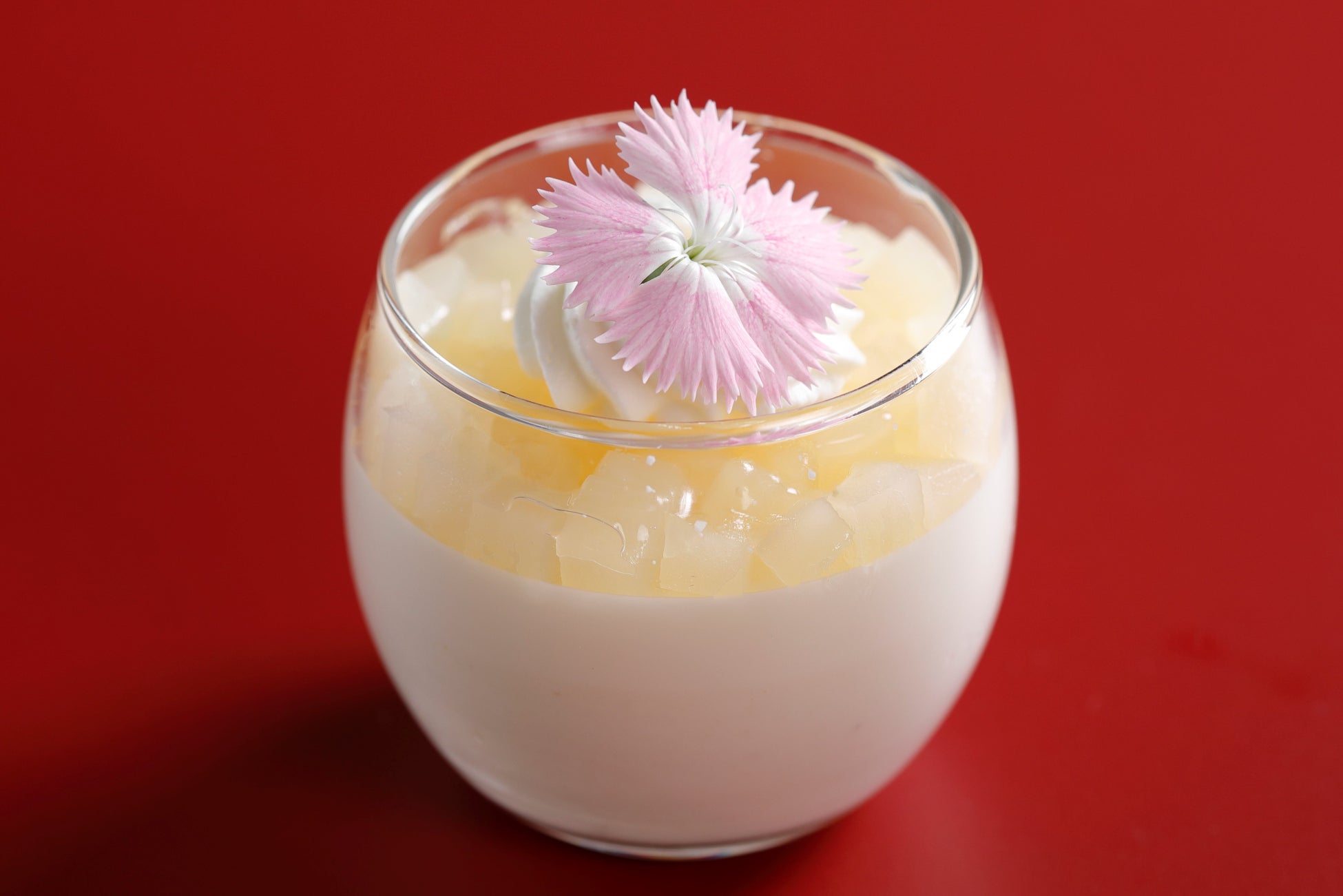 洋梨のムースと洋梨のジュレをマスカルポーネのムースで包み、洋梨のコンポートをトッピングしました。洋梨のとろけるような食感と芳醇な香りをお楽しみいただけるグラススイーツです。