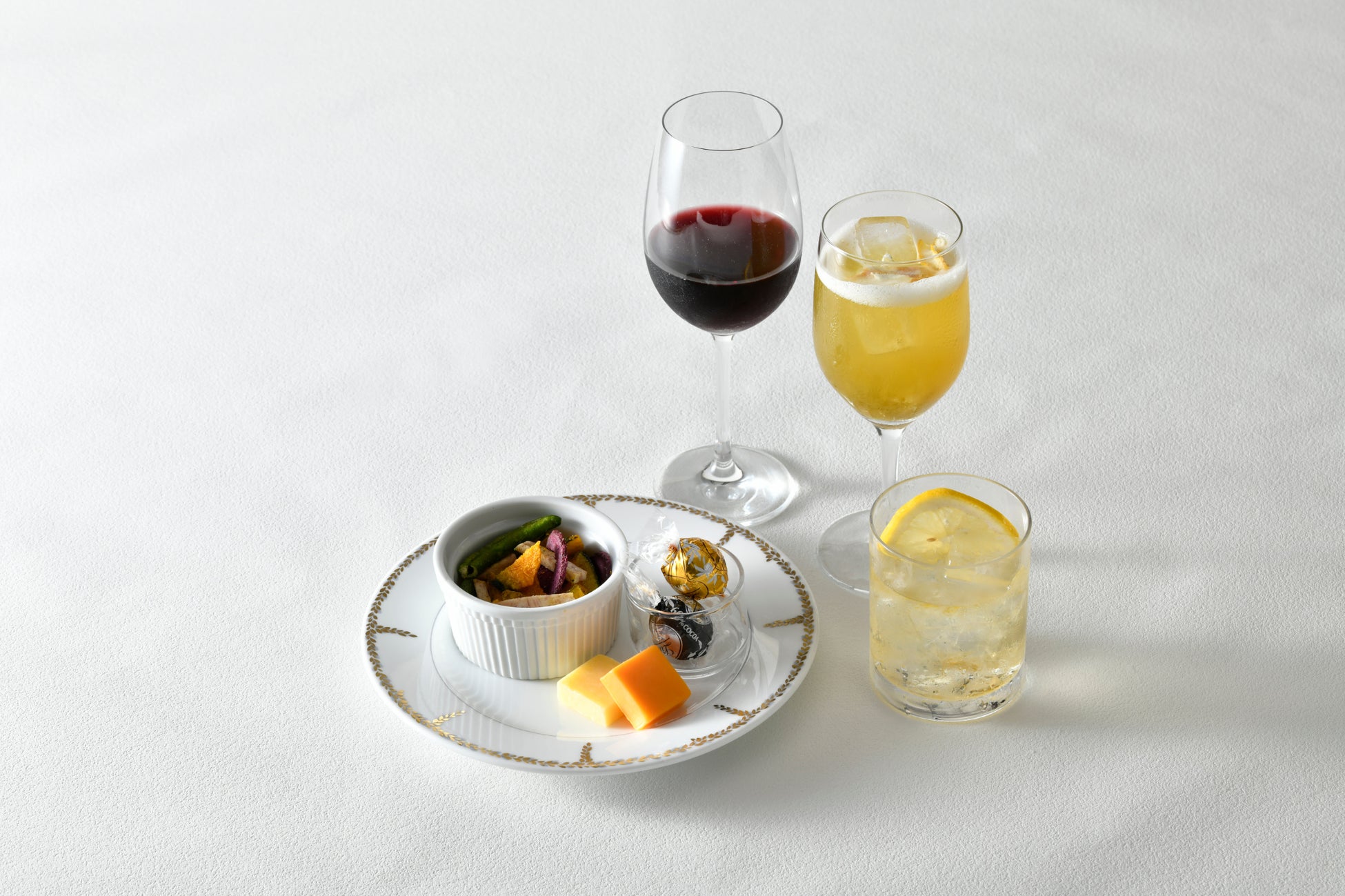スパークリングワイン、白ワイン、赤ワイン、ウイスキー、ハイボール、ウイスキートディ、ビール、ジンジャーエール、ペリエ、オレンジジュース、グレープフルーツジュース